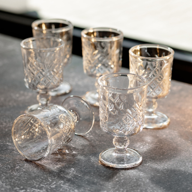 Набор рюмок на ножке из толстого стекла станет отличным дополнением к любому столу, придавая элегантность и изысканность. Их лаконичный дизайн подходит для разных стилей сервировки – от классического до современного. Толстое прозрачное стекло не только создает эстетический вид, но и обеспечивает высокую прочность и долговечность в использовании. Основные характеристики: Материал: стекло; Объем: 60 мл; Диаметр: 5 см; Высота: 8.5 см. Каждая рюмка имеет компактную высоту 8.5 см, что обеспечивает комфортное использование, а диаметр 5 см позволяет удобно держать ее в руке. Ножка добавляет изящества, что делает эти рюмки идеальными для подачи крепких напитков, таких как водка, наливки или ликеры. Благодаря продуманной форме напитков в этих рюмках лучше раскрывают свой аромат. Этот набор станет отличным выбором как для повседневного использования, так и для праздничных мероприятий. Его также можно использовать в качестве подарка – практичного, стильного и долговечного. Благодаря своим характеристикам рюмки легко чистятся и устойчивы к образованию царапин, что делает их еще более универсальными.