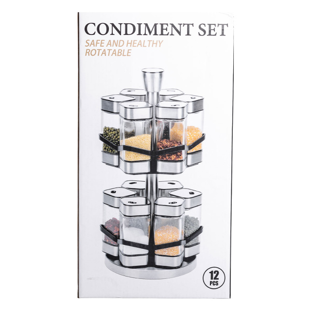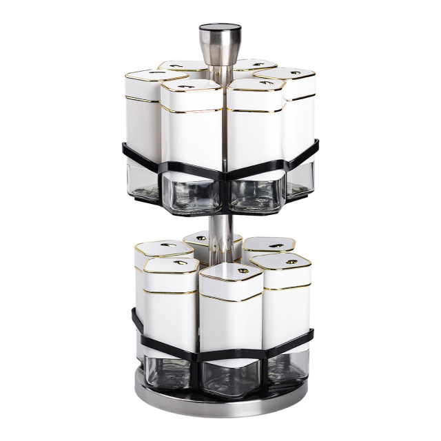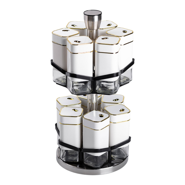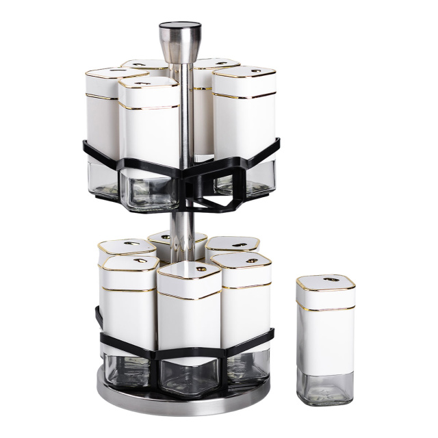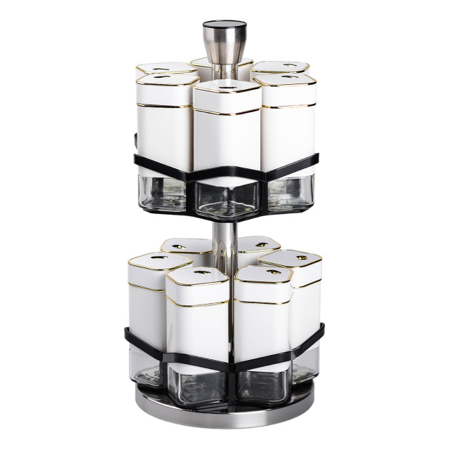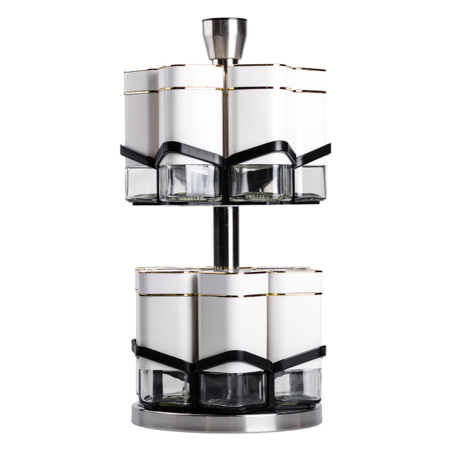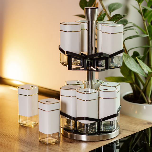 Набор банок для специй из 12 штук на подставке-карусели – это идеальное решение для организации специй на кухне, сочетающее функциональность и стильный дизайн. Баночки изготовлены из прозрачного стекла, что позволяет легко определять содержимое и контролировать его количество. Герметичные металлические крышки надежно сохраняют свежесть и аромат специй, защищая их от влаги и посторонних запахов. Основные характеристики: Количество баночек: 12 штук; Размер набора: 15х15х32.5 см; Объем баночки: 120 мл; Материал баночек: стекло/пластик; Материал подставки: металл; Тип подставки: Карусель; Назначение: Для хранения специй, трав, соли, перца. Особенностью набора является удобная подставка-карусель, обеспечивающая легкий доступ к каждой баночке. Подставка изготовлена из прочного пластика и металла, что обеспечивает долговечность и стойкость конструкции. Компактный и эстетический дизайн подставки позволяет организовать специи максимально эффективно, сохраняя порядок на кухонном столе или шкафу. Этот набор банок станет незаменимым помощником для кулинаров, помогая удобно хранить специи, травы, соль, перец или смеси приправ. Благодаря высокому качеству материалов и универсальному дизайну, он также станет отличным подарком для любителей кулинарии.