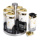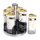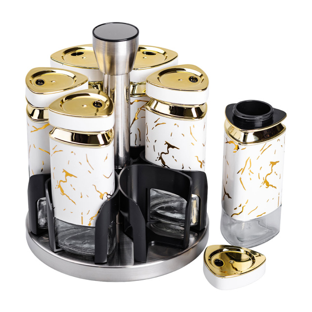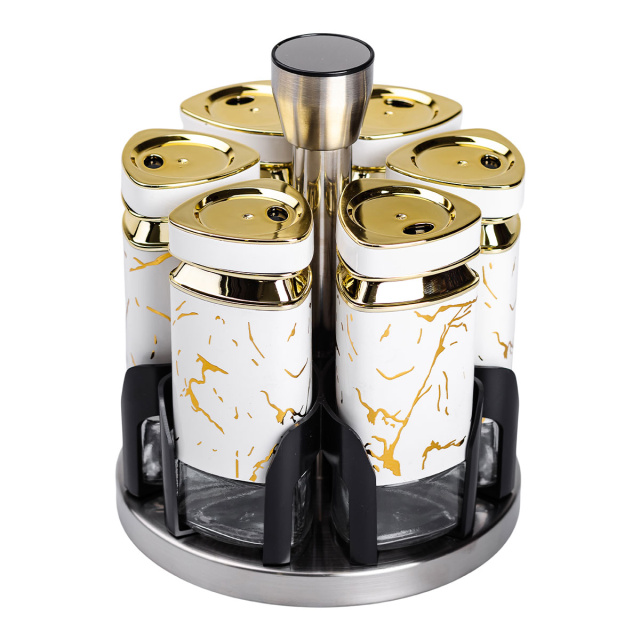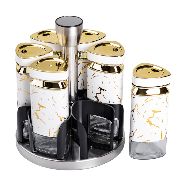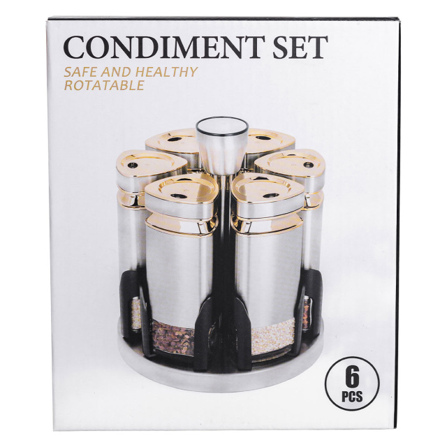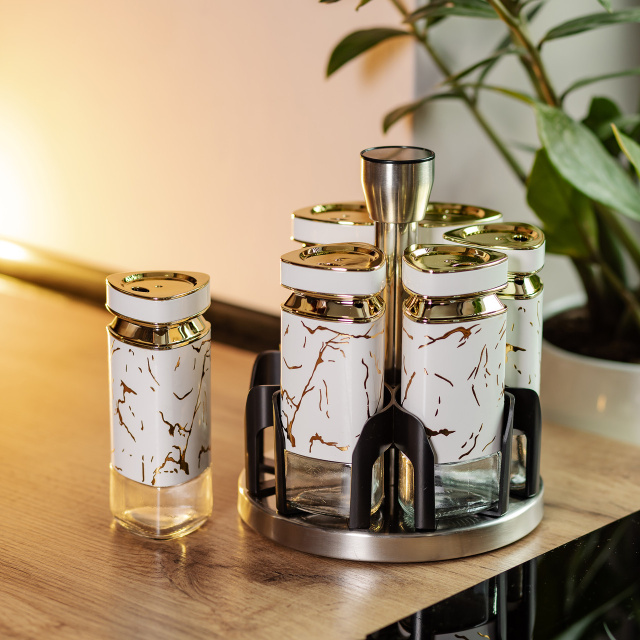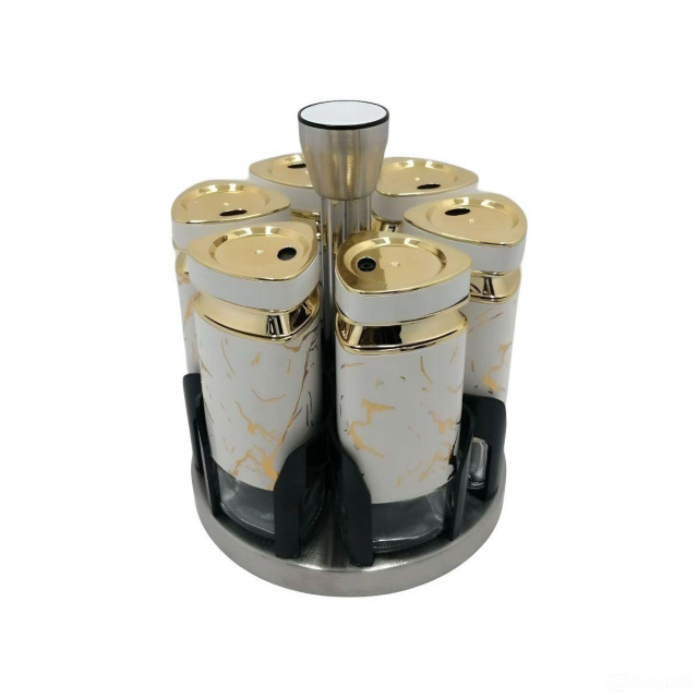 Набор баночек для специй из 6 штук на подставке - это компактный и удобный аксессуар для организации кухонного пространства. Баночки изготовлены из комбинации стекла и пластика, что обеспечивает легкость и долговечность. Прозрачный корпус позволяет быстро определять содержимое и его количество, а герметичные крышки сохраняют свежесть специй и предотвращают попадание влаги. Основные характеристики: Количество баночек: 6 штук; Высота баночки: 12.5 см; Диаметр баночки: 5 см; Объем баночки: 120 мл; Высота набора: 19 см; Диаметр набора: 15 см; Материал баночек: стекло/пластик; Материал подставки: металл; Назначение: Для хранения специй, трав, соли, перца, специй. Подставка, изготовленная из металла и пластика, обеспечивает надежную устойчивость и компактное размещение баночек. Ее современный и минималистичный дизайн гармонично дополнит любой кухонный интерьер. Благодаря небольшому размеру набор легко располагается на столе или в шкафу, не занимая много места. Этот набор подходит для хранения специй, трав, соли или перца, помогая удобно организовать кухонный процесс. Благодаря высокому качеству материалов и функциональному дизайну, он станет полезным элементом вашей кухни или приятным подарком.