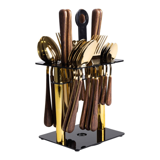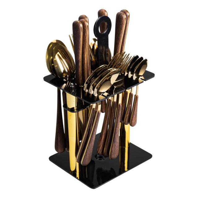 Набор столовых приборов на подставке серебристый - это стильный и практичный аксессуар для любой кухни. В комплект входит 24 предмета, рассчитанные на 6 персон: 6 столовых ложек, 6 чайных ложек, 6 вилок и 6 ножей. Благодаря современному дизайну и изящному сочетанию материалов, этот набор станет прекрасным дополнением к сервировке стола как в повседневной жизни, так и во время торжественных мероприятий. Основные характеристики: Количество предметов в наборе: 24 шт.; Количество персон: 6; Материал: нержавеющая сталь, дерево; Упаковка: коробка; Размеры приборов: длина столового ножа: 22.5 см; длина столовой ложки: 20 см; длина столовой вилки: 20 см; длина чайной ложки: 14 см. Комплектация набора: столовый нож: 6 шт.; столовая ложка: 6 шт.; столовая вилка: 6 шт.; чайная ложка: 6 шт.. Особенностью набора являются деревянные ручки столовых приборов, которые не только добавляют эстетической привлекательности, но и обеспечивают удобное использование. Натуральное дерево приятное на ощупь, не скользит в руках и создает ощущение тепла и комфорта. Серебристые металлические части выполнены из качественного материала, устойчивого к коррозии, что гарантирует долговечность и сохранение красивого вида даже при ежедневном использовании. Для удобного хранения и организации предусмотрена металлическая подставка, которая помогает компактно расположить приборы и поддерживать порядок на кухне. Она легкая, прочная и легко моется, что делает ее практичным дополнением к набору. Благодаря сочетанию стильного дизайна, функциональности и качества материалов, этот набор столовых приборов станет идеальным выбором для тех, кто ценит комфорт и эстетику в своем доме.