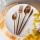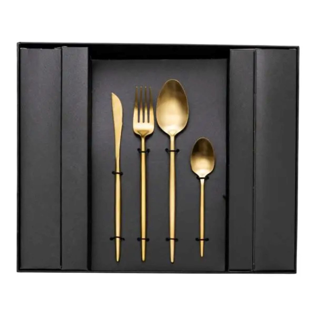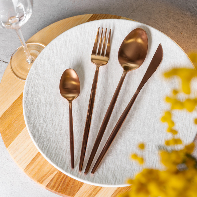Набор столовых приборов бронзового цвета состоит из 24 предметов: 6 столовых ложек, 6 чайных ложек, 6 вилок и 6 столовых ножей. Каждый предмет имеет классический дизайн без лишних декоративных элементов, что делает их универсальными для ежедневного использования или сервировки праздничного стола. Столовые приборы имеют гладкую полированную поверхность, которая легко очищается и не задерживает загрязнения. Основные характеристики: Количество предметов в наборе: 24 шт.; Количество персон: 6; Материал: нержавеющая сталь; Упаковка: коробка; Размеры приборов: длина столового ножа: 21.5 см; длина столовой ложки: 22.5 см; длина столовой вилки: 22 см; длина чайной ложки: 14.5 см. Комплектация набора: столовый нож: 6 шт.; столовая ложка: 6 шт.; столовая вилка: 6 шт.; чайная ложка: 6 шт.. Материал изготовления - нержавеющая сталь, которая отличается прочностью, устойчивостью к коррозии и долговечностью. Лезвия ножей имеют заточенную кромку, что обеспечивает удобное нарезание продуктов. Вилки и ложки имеют эргономичную форму, что способствует комфортному удержанию в руке во время приема пищи. Все предметы набора можно мыть в посудомоечной машине без риска потери блеска или повреждения поверхности. Комплект поставляется в базовой упаковке, которая защищает приборы от механических повреждений во время транспортировки. Набор подходит для использования в домашних условиях, заведениях общественного питания или как вариант для временного жилья. Благодаря стандартным размерам и нейтральному дизайну эти столовые приборы легко сочетаются с различными стилями посуды и текстиля для сервировки стола.