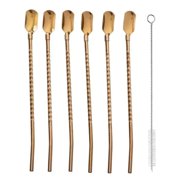 Набор витых ложек с трубочками для напитков – стильное и удобное решение для любителей напитков. Этот комплект из 6 предметов сочетает в себе функции ложки и трубочки, позволяя не только перемешивать напитки, но и пить их с комфортом. Он идеально подходит для соков с мякотью, коктейлями, чаем, смузи и другими напитками, делая процесс их употребления комфортным и приятным. Основные характеристики : Количество предметов в наборе: 7 (6 ложек-трубочек, щеточка для мытья); Материал: нержавеющая сталь; Размеры : длина ложек : 22 см; длина щетки : 20 см. Ложки-трубочки изготовлены из нержавеющей стали, что обеспечивает их прочность, устойчивость к хранению и хранению. Полированная поверхность придает им эстетичный вид и способствует очистке, а скрученная ручка обеспечивает удобный захват, предотвращающий Благодаря универсальному дизайну и стандартному размеру эти ложки прекрасно сочетаются с другими барными аксессуарами. Они легко моются как вручную, так и в посудомоечной машине.