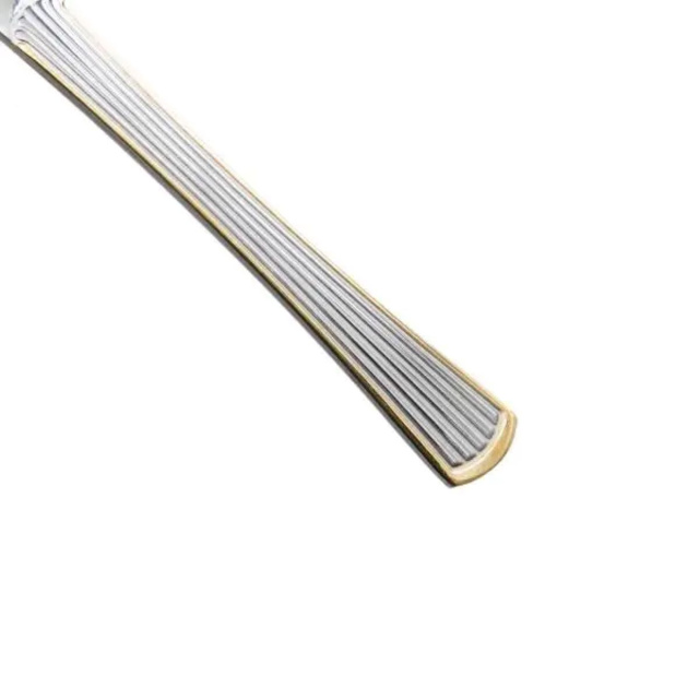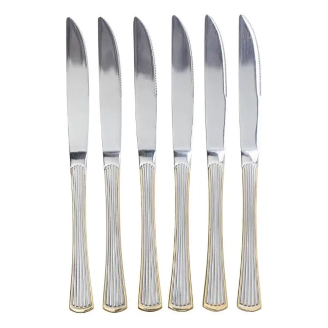 Набор столовых ножей состоит из 6 штук, упакованных в блистерную упаковку. Классический дизайн сочетает серебристое лезвие и золотистую ручку, что придает приборам элегантный вид. Благодаря сдержанному оформлению ножи легко сочетаются с различными стилями столовой посуды. Основные характеристики: Количество предметов в наборе: 6 шт.; Количество персон: 6; Длина: 22.5 см; Материал: нержавеющая сталь; Упаковка: пакет. Изготовленные из нержавеющей стали, ножи имеют прочную конструкцию, устойчивую к коррозии и механическим повреждениям. Лезвие обеспечивает комфортное нарезание различных продуктов, а эргономичная форма ручки способствует удобному удержанию. Золотистое покрытие ручки добавляет эстетической привлекательности, сохраняя при этом практичность в использовании. Набор подходит как для ежедневного использования, так и для праздничных сервировок. Блистерная упаковка обеспечивает защиту ножей во время транспортировки и удобство хранения. Приборы легко очищаются вручную или в посудомоечной машине без потери блеска и качества покрытия.
