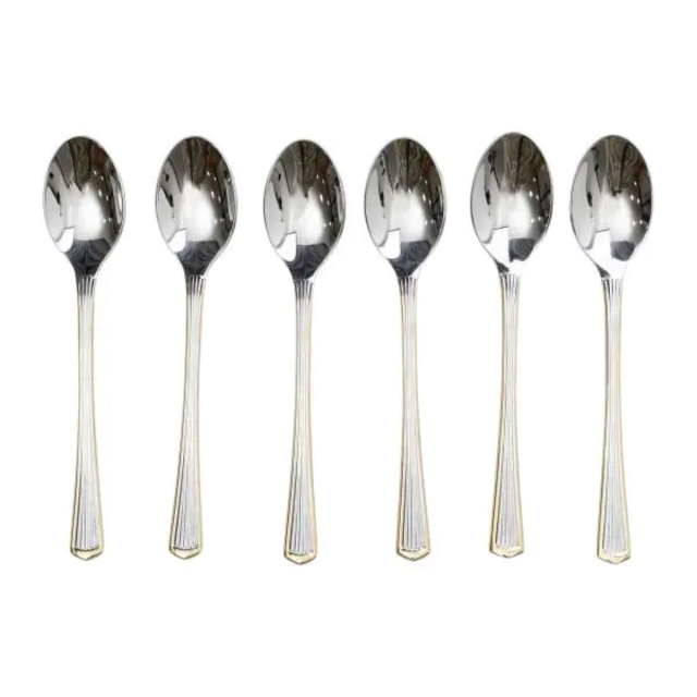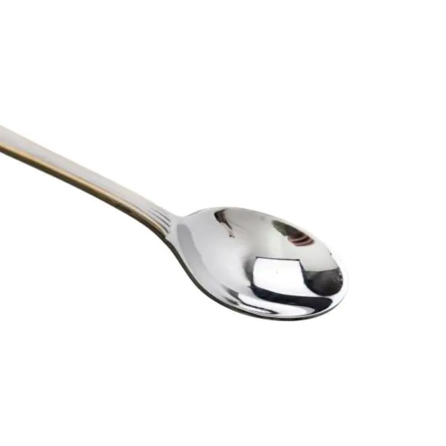 Набор чайных ложек состоит из 6 штук, упакованных в блистерную упаковку, что обеспечивает удобное хранение и защиту во время транспортировки. Ложки изготовлены из высококачественного металла с серебристым покрытием, что придает им элегантный вид. Ручки украшены золотистыми элементами, выполненными в классическом стиле, что придает особый шарм каждой ложке. Основные характеристики: Количество предметов в наборе: 6 шт.; Количество персон: 6; Длина: 15.3 см; Материал: нержавеющая сталь; Упаковка: пакет. Размер каждой ложки оптимальный для использования во время чаепития, а также подходит для десертов или легких закусок. Легко чистится, что делает их практичными для ежедневного использования. Классический дизайн подходит для различных интерьеров, добавляя изысканности столовым приборам. Для ухода за изделием рекомендуется использовать мягкие моющие средства, не повреждающие покрытие. После мытья лучше вытирать ложки досуха, чтобы сохранить их блеск и продлить срок службы.