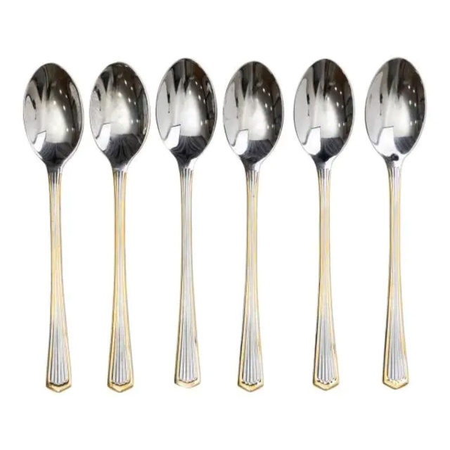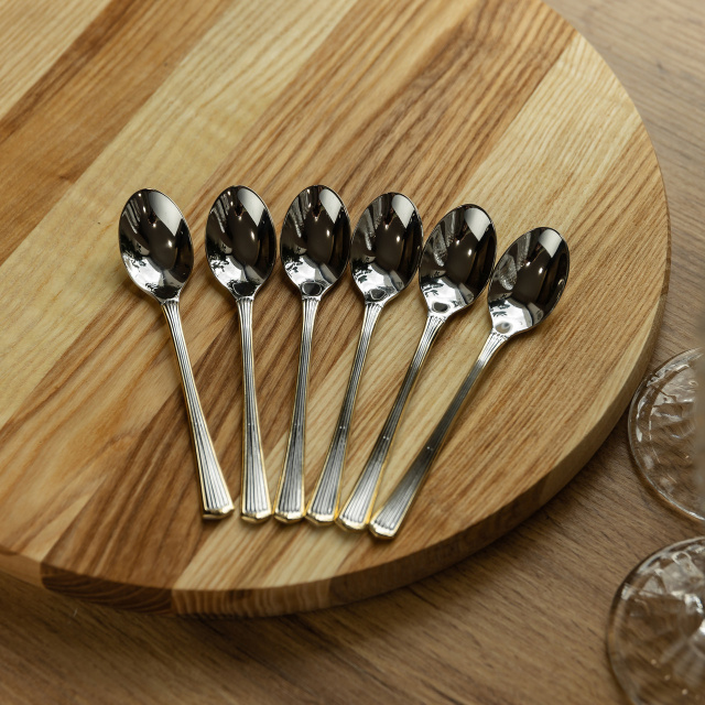 Набор кофейных ложек включает 6 штук, упакованных в удобную блистерную упаковку для защиты во время хранения и транспортировки. Ложки изготовлены из высококачественного металла с серебристым покрытием, что придает им стильный вид. Ручки украшены золотистыми элементами, выполненными в классическом стиле, которые добавляют элегантности и утонченности каждой ложке. Основные характеристики: Количество предметов в наборе: 6 шт.; Количество персон: 6; Длина: 12.3 см; Материал: нержавеющая сталь; Упаковка: пакет. Эти ложки идеально подходят для кофе, эспрессо или других горячих напитков, а также могут использоваться для десертов. Их размер обеспечивает удобство использования и добавляет стиль к любому столу, подходя как для повседневных, так и для праздничных событий. Для ухода за изделием рекомендуется использовать мягкие моющие средства, не повреждающие покрытие. После мытья стоит вытирать ложки до сухая, чтобы сохранить их блеск и продлить срок службы.