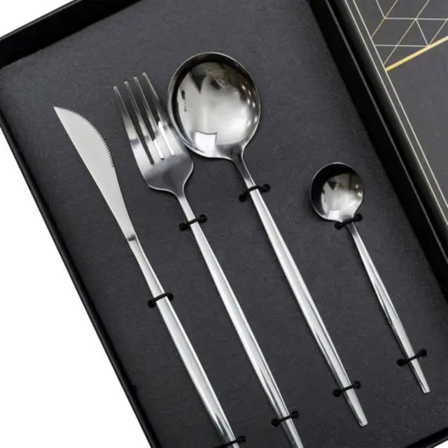 Набор столовых приборов состоит из 24 предметов, рассчитанных на обслуживание 6 персон. В комплект входят 6 столовых ложек, 6 чайных ложек, 6 вилок