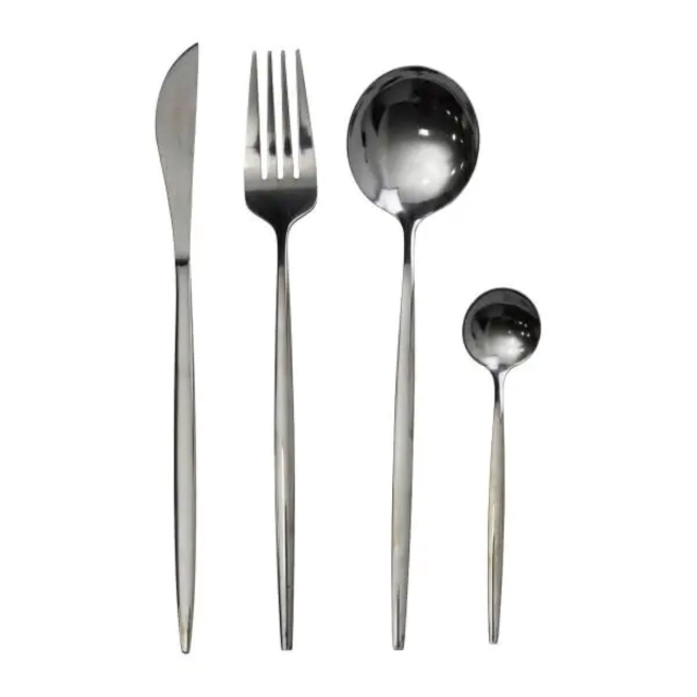 Набор столовых приборов состоит из 24 предметов, рассчитанных на обслуживание 6 персон. В комплект входят 6 столовых ложек, 6 чайных ложек, 6 вилок