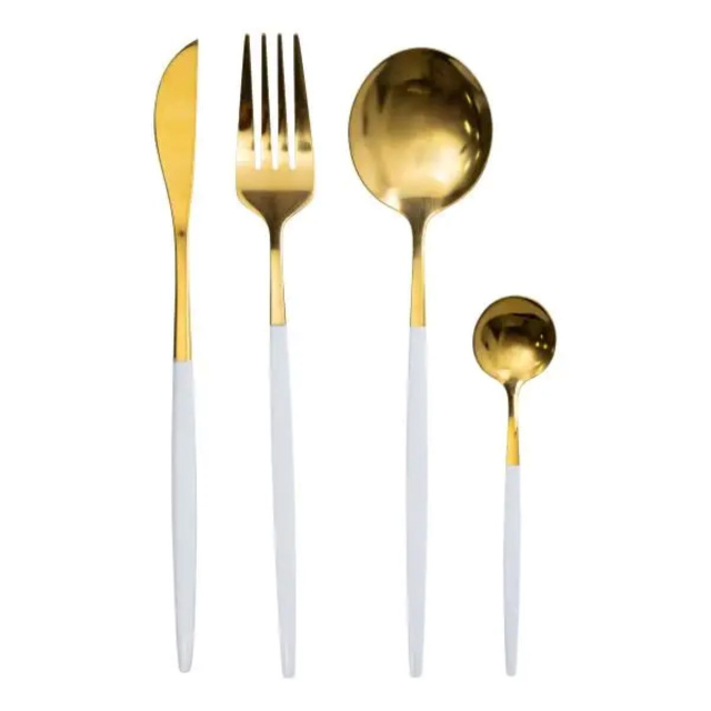 Набор столовых приборов включает 24 предмета, предназначенные для обслуживания 6 персон. В комплект входят 6 столовых ложек, 6 чайных ложек, 6 вилок и 6 столовых ножей. Основная часть приборов имеет золотистый оттенок, а ручки выполнены в белом цвете, что создает контрастный и сдержанный вид. Основные характеристики: Количество предметов в наборе: 24 шт.; Количество персон: 6; Материал: нержавеющая сталь; Упаковка: коробка; Размеры приборов: длина столового ножа: 22.5 см; длина столовой ложки: 20.8 см; длина столовой вилки: 21.5 см; длина чайной ложки: 12.8 см. Комплектация набора: столовый нож: 6 шт.; столовая ложка: 6 шт.; столовая вилка: 6 шт.; чайная ложка: 6 шт.. Материалом изготовления является нержавеющая сталь, которая обеспечивает устойчивость к коррозии и механическим повреждениям. Поверхность гладкая, что облегчает очистку и уход. Белые ручки имеют эргономичную форму, что способствует удобному захвату и комфортному использованию. Комплект подходит как для ежедневного применения, так и для сервировки праздничного стола. Благодаря сочетанию золотистой стали с белыми ручками, приборы гармонично вписываются в современный интерьер кухни и могут комбинироваться с различными видами посуды.