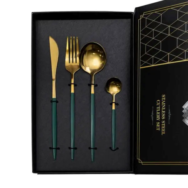 Набор столовых приборов включает 24 предмета, предназначенные для обслуживания 6 персон. В комплект входят 6 столовых ложек, 6 чайных ложек, 6 вилок и 6 столовых ножей. Основная часть приборов имеет золотистый оттенок, а ручки выполнены в зеленом цвете, что создает контрастный и сдержанный вид. Основные характеристики: Количество предметов в наборе: 24 шт.; Количество персон: 6; Материал: нержавеющая сталь; Упаковка: коробка; Размеры приборов: длина столового ножа: 22.5 см; длина столовой ложки: 20.8 см; длина столовой вилки: 21.5 см; длина чайной ложки: 12.8 см. Комплектация набора: столовый нож: 6 шт.; столовая ложка: 6 шт.; столовая вилка: 6 шт.; чайная ложка: 6 шт.. Материалом изготовления является нержавеющая сталь, которая обеспечивает устойчивость к коррозии и механическим повреждениям. Поверхность гладкая, что облегчает очистку и уход. Зеленые ручки имеют эргономичную форму, что способствует удобному захвату и комфортному использованию. Комплект подходит как для ежедневного применения, так и для сервировки праздничного стола. Благодаря сочетанию золотистой стали с зелеными ручками, приборы гармонично вписываются в современный интерьер кухни и могут комбинироваться с различными видами посуды.