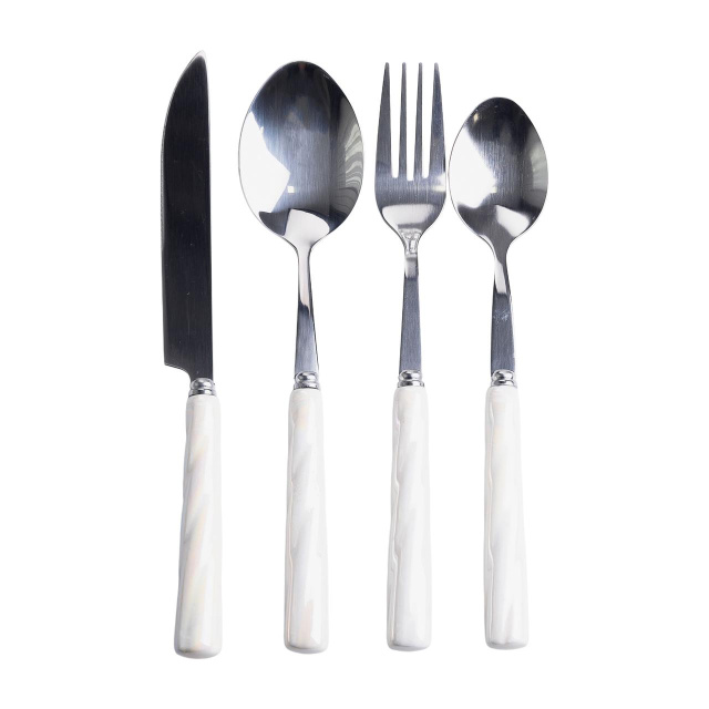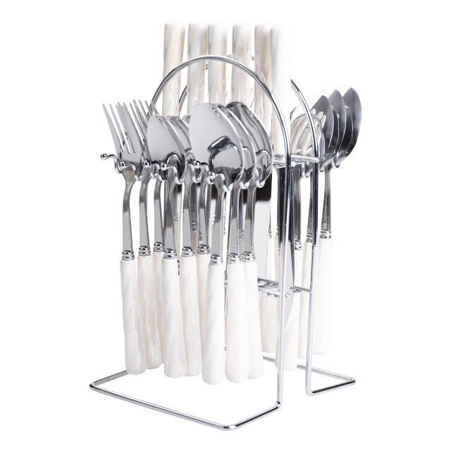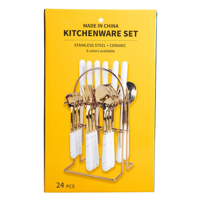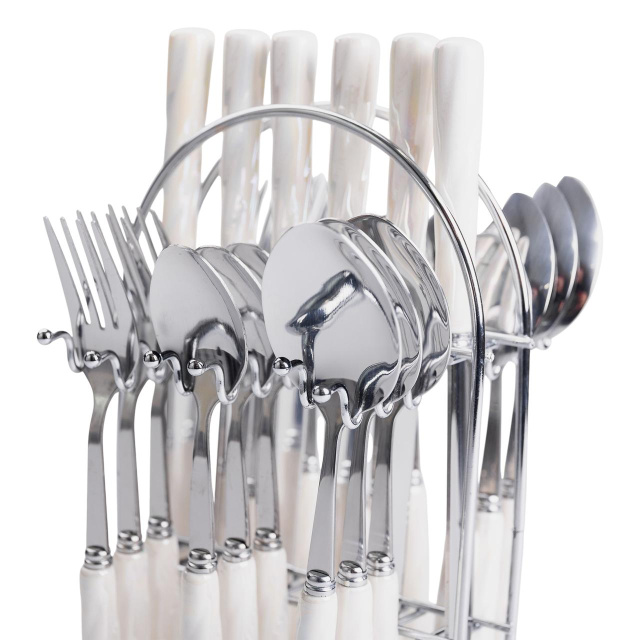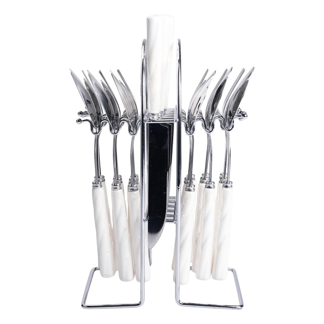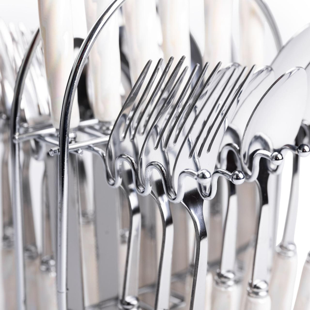 .Набор столовых приборов включает 24 предмета, предназначенные для шести персон. В комплект входят 6 столовых ложек, 6 чайных ложек, 6 вилок и 6 столовых ножей. Основная часть приборов изготовлена из нержавеющей стали с серебристым покрытием, а ручки выполнены из белой керамики. Для удобного хранения предусмотрена металлическая подставка. Основные характеристики: Количество предметов в наборе: 24 шт.; Количество персон: 6; Материал: нержавеющая сталь, керамика; Упаковка: коробка; Размеры приборов: длина столового ножа: 19.5 см; длина столовой ложки: 18.5 см; длина столовой вилки: 19 см; длина чайной ложки: 17.5 см. Комплектация набора: столовый нож: 6 шт.; столовая ложка: 6 шт.; столовая вилка: 6 шт.; чайная ложка: 6 шт.. Нержавеющая сталь обеспечивает прочность и устойчивость к коррозии, а керамические ручки добавляют эстетической привлекательности, но требуют бережного ухода. Поверхность приборов гладкая, что упрощает очистку. Металлическая подставка позволяет компактно размещать комплект на кухонной поверхности или в сервировочной зоне. Комплект подходит для ежедневного использования и праздничных событий. Сочетание серебристого металла, белой керамики и организованного хранения делает этот набор совместимым с различными стилями сервировки. Металлическая подставка способствует поддержанию порядка и легкому доступу к приборам.