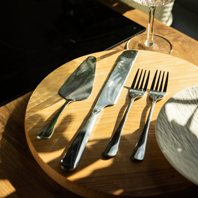 Набор столовых приборов для подачи тортов серебристый состоит из четырех предметов: лопатки, ножа и двух вилок. Все элементы изготовлены из нержавеющей стали, что обеспечивает их долговечность и устойчивость к коррозии. Гладкая поверхность приборов способствует легкой очистке и предотвращает образование пятен. Основные характеристики: Количество предметов: 4; Материал: нержавеющая: сталь. Длина приборов: лопатка: 23 см; вилка 2 шт.: 17.5 см; нож: 27 см. Лопатка имеет удобную форму с заостренным краем, что облегчает подачу торта. Нож предназначен для точной нарезки десертов. Благодаря простому дизайну набор подходит как для домашнего использования, так и для праздничных мероприятий. Приборы выполнены в серебристом цвете без лишних декоративных элементов. Это позволяет сочетать их с различными стилями сервировки стола. Набор пригоден для мытья в посудомоечной машине в соответствии с рекомендациями производителя.