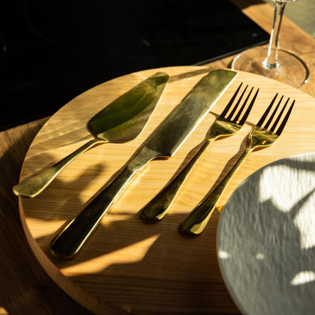 Набор столовых приборов для подачи тортов серебристый состоит из четырех предметов: лопатки, ножа и двух вилок. Все элементы изготовлены из нержавеющей стали, что обеспечивает их долговечность и устойчивость к коррозии. Гладкая поверхность приборов способствует легкой очистке и предотвращает образование пятен. Основные характеристики: Количество предметов: 4; Материал: нержавеющая: сталь. Длина приборов: лопатка: 23 см; вилка 2 шт.: 17.5 см; нож: 27 см. Лопатка имеет удобную форму с заостренным краем, что облегчает подачу торта. Нож предназначен для точной нарезки десертов. Благодаря простому дизайну набор подходит как для домашнего использования, так и для праздничных мероприятий. Приборы выполнены в серебристом цвете без лишних декоративных элементов. Это позволяет сочетать их с различными стилями сервировки стола. Набор пригоден для мытья в посудомоечной машине в соответствии с рекомендациями производителя.