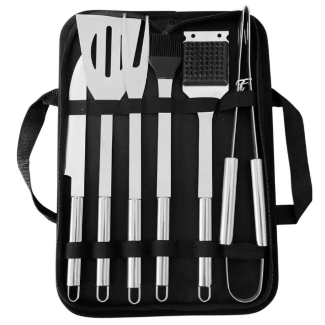 Набор аксессуаров для барбекю состоит из 6 предметов, изготовленных из нержавеющей стали. Материал обеспечивает прочность, устойчивость к высоким температурам и коррозии, что делает изделия пригодными для использования на открытом воздухе. Гладкая поверхность облегчает очистку после приготовления пищи. Основные характеристики: Размеры набора: 40х10х5 см; Длина приборов: 35 см; Количество предметов в наборе: 6; Материал: алюминий, нержавеющая сталь. Комплектация: Нож; Лопатка; Вилка для мяса; Щипцы; Кисточка силиконовая; Щетка для чистки. В комплект входят основные инструменты, необходимые для приготовления барбекю. Эргономичная форма обеспечивает удобство в использовании, а оптимальная длина ручек позволяет работать с горячими продуктами на безопасном расстоянии. Конструкция изделий предусматривает надежность соединения ручек с рабочими частями, что повышает долговечность приборов. Набор укомплектован чехлом из ткани для удобной транспортировки и хранения. Компактный формат позволяет легко переносить приборы и хранить их в упорядоченном виде, что особенно удобно для выездов на природу, пикников и кемпинга.