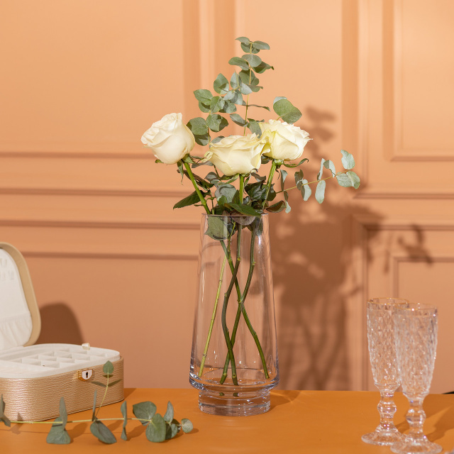 Стеклянная декоративная ваза с широким горлом изготовлена из прозрачного стекла высокого качества. Она имеет элегантную форму с плавными линиями, что позволяет создавать стильные цветочные композиции или использовать ее как самостоятельный декоративный элемент. Высота вазы составляет 21 см, диаметр на верхнем крае - 7 см, что обеспечивает удобство в размещении цветов разных размеров. Основные характеристики: Материал: стекло; Объем: 1 л; Диаметр: общий - 8 см, верхний - 7 см, нижний - 8.5 см; Высота: 21 см; Глубина: 18.5 см. Широкое горло вазы позволяет свободно размещать ветви, большие цветочные композиции или даже декоративные элементы, такие как камни или водоросли, что подчеркивает ее универсальность. Прозрачное стекло позволяет четко увидеть внутреннее содержимое и придает вазе легкости и элегантности. Для ухода за вазой рекомендуется использовать мягкие моющие средства и избегать абразивных материалов, чтобы сохранить ее без повреждений. Очистка вручную поможет сохранить чистоту и первоначальный вид.