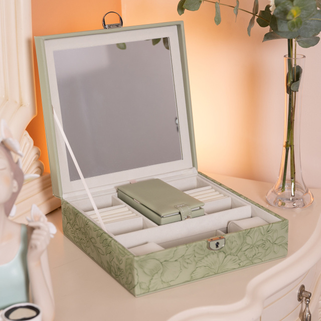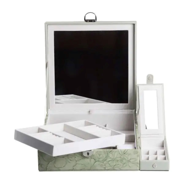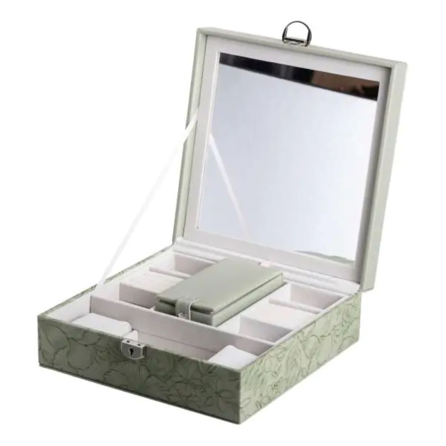Шкатулка для украшений из эко кожи, 2 яруса – идеальный органайзер для бережного хранения ваших ювелирных изделий. Компактный и функциональный дизайн с размерами 25×25×8.5 см обеспечивает удобство использования и легкость хранения. Выполненная из качественной эко кожи, эта шкатулка станет стильным дополнением любого интерьера, сочетая в себе практичность и элегантность, а замок обеспечит сохранность Ваших украшений. Основные характеристики органайзера для хранения бижутерии размеры шкатулки для украшений 25×25×8.5 см; количество ярусов - 2 шт; количество отсеков - 17 шт; материал корпуса - экокожа; внутреннее покрытие - велюр; зеркало в комплекте. Шкатулка оборудована двумя вместительными ярусами, предлагающими 17 разнообразных отсеков. Это позволяет аккуратно разместить кольца, серьги, цепочки, браслеты и другие украшения, предотвращая их повреждения и спутывание. Внутреннее покрытие из мягкого велюра обеспечивает дополнительную защиту от царапин и повреждений. Основные преимущества шкатулки для украшений из эко-кожи Экологичная кожа приятна на ощупь, долговечна и устойчива к внешним повреждениям, а велюровое покрытие внутри бережно хранит драгоценности и предотвращает появление царапин. Благодаря 17 отдельным отсекам и двум просторным ярусам, все украшения аккуратно размещены и всегда находятся под рукой. Современное исполнение и сдержанные цвета органично вписываются в любой интерьер, превращая органайзер в стильный элемент декора. Встроенное зеркало добавляет функциональности и облегчает выбор украшений. Качественный замок обеспечивает сохранность и защиту ювелирных изделий от случайного открытия и потери. Отличное решение для подарка по любому поводу: День рождения, 8 марта, годовщина, День святого Валентина или Новый год. Дополнительным преимуществом модели является встроенное зеркало, удобное для примерки украшений и ухода за собой. Надежный замок гарантирует безопасное хранение ваших драгоценностей, исключая случайное открытие шкатулки. Шкатулка из эко кожи отлично подходит в качестве подарка на любой праздник, а также будет полезным приобретением для личного использования. Купить шкатулку для ювелирных изделий можно с доставкой по всей Украине.