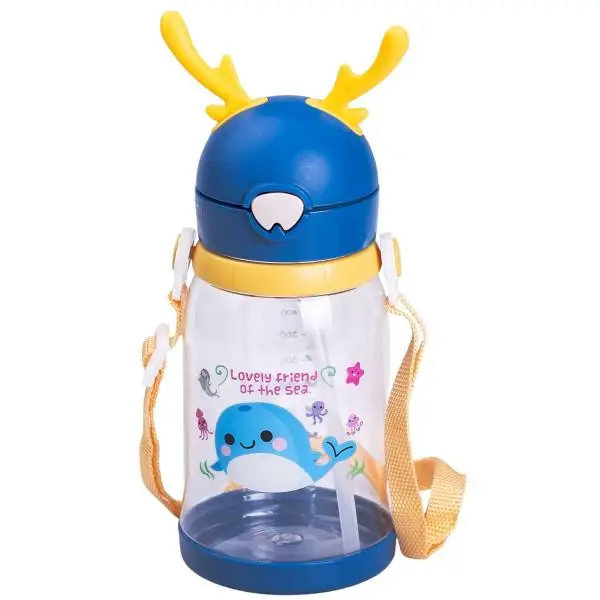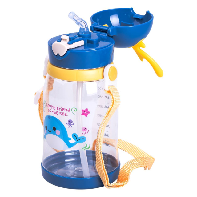 Бутылка для воды детская 550 мл на ремешке бутылочка с трубочкой для спорта и школы Синяя HP-14-44BL