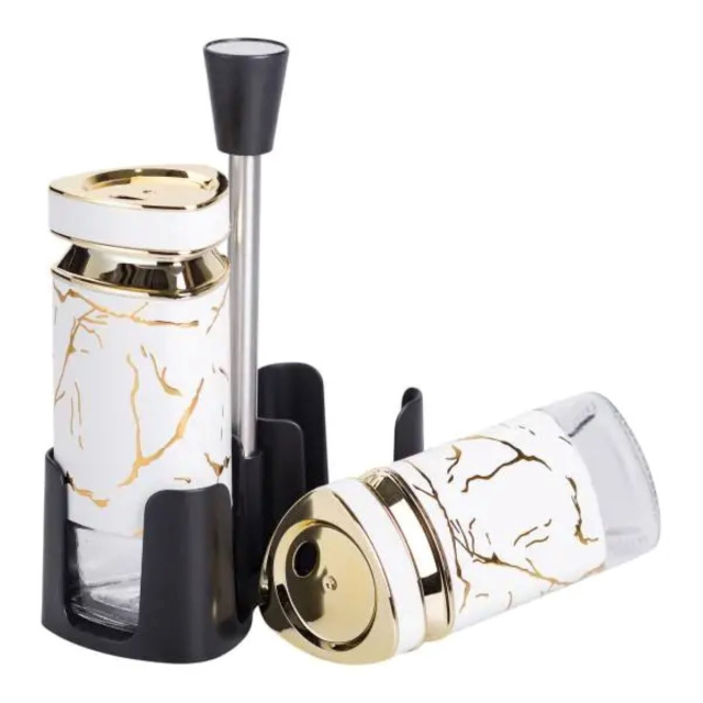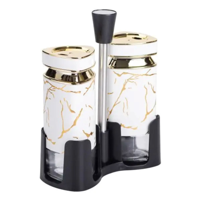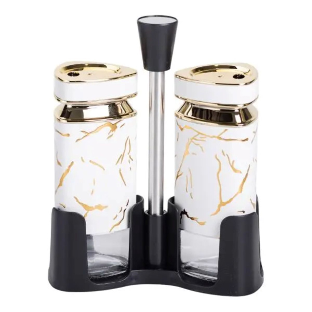 Набор емкостей для специй на подставке с ручкой изготовлен из пластика и стекла и состоит из солонки, перечницы и подставки с ручкой. Баночки изготовлены из стекла, которое не впитывает запахи и прекрасно сохраняет свежесть и вкусовые качества специй. Набор для специй на подставке из 2 предметов не только придаст уют вашей кухне, но и обеспечит удобство при приготовлении блюд. Основные характеристики набора баночек для приправ Размер набора: 13х5.5х15.5 см; Объем емкостей: 120 мл; Высота емкостей: 12 см; материал емкостей: стекло, пластик; материал крышек: пластик; материал подставки: пластик, металл. Подставка обеспечивает надежную фиксацию контейнеров, предотвращая их скольжение и создавая компактный и аккуратный вид на вашей кухне. Этот набор для специй обеспечит удобство использования и подчеркнет ваш вкус к деталям.