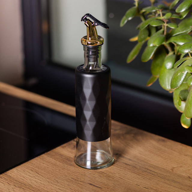 Бутылка для масла объемом 300 мл – стильный и функциональный аксессуар, который станет незаменимым помощником на кухне. Благодаря изящному дизайну бутылка отлично впишется как в домашний интерьер, так и в профессиональное кухонное пространство. Основные характеристики: Объем: 300 мл; Высота: 24.5 см; Диаметр: 2.7 см; Материал: стекло, металл; Особенность: герметичная крышка с дозатором для точного наливания. Металлическая крышка с дозатором обеспечивает точность и удобство при наливании масла или уксуса, что позволяет избежать перерасходов. Герметичная конструкция сохраняет свежесть продуктов и предотвращает попадание воздуха и посторонних запахов. Компактный размер и эргономичная форма делают бутылку легкой в ​​использовании и хранении. Этот аксессуар отлично подходит для подачи на стол, организации пространства на кухне или в кафе. Бутылка для масла и уксуса станет не только практичным, но и стильным дополнением к вашей столовой посуде.