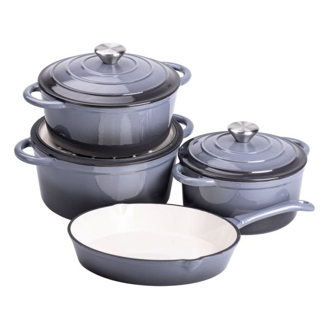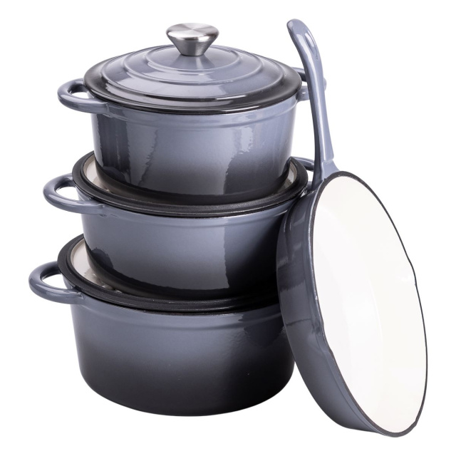 Набор чугунной посуды создан для тех, кто ценит качество и удобство в приготовлении пищи. В него входят три кастрюли объемом 2, 3 и 5 литров, а также компактная сковорода на 1 литр. Такой набор позволяет с легкостью готовить супы, рагу, мясные и овощные блюда, обеспечивая идеальное распределение тепла. Чугун отличается высокой теплоемкостью, что способствует равномерному прогреву продуктов и сохранению их естественного вкуса. Толстые стенки и дно предотвращают перегрев и обеспечивают стабильную температуру во время готовки. Литые ручки удобны в использовании и устойчивы к высоким температурам. Основные характеристики набора чугунной посуды с эмалированным покрытием Кастрюля на 2 литра Диаметр дна: 16,5 см; Высота кастрюли без крышки: 9,5 см; Высота кастрюли с крышкой: 16 см. Кастрюля на 3 литра Диаметр дна: 19 см; Высота кастрюли без крышки: 9 см; Высота кастрюли с крышкой: 16 см. Кастрюля на 5 литра Диаметр дна 21 см; Высота кастрюли без крышки: 11 см; Высота кастрюли с крышкой: 16 см. Сковорода на 1 литр Диаметр дна: 22 см; Высота сковороды с крышкой: 4 см. Посуда подходит для газовых и электрических плит, а также для приготовления на открытом огне, что делает ее отличным выбором как для кухни, так и для кулинарных экспериментов на природе. При правильном уходе чугун служит десятилетиями, не теряя своих свойств. Этот набор станет незаменимым помощником для любителей вкусных и насыщенных блюд, обеспечивая удобство и долговечность на долгие годы.