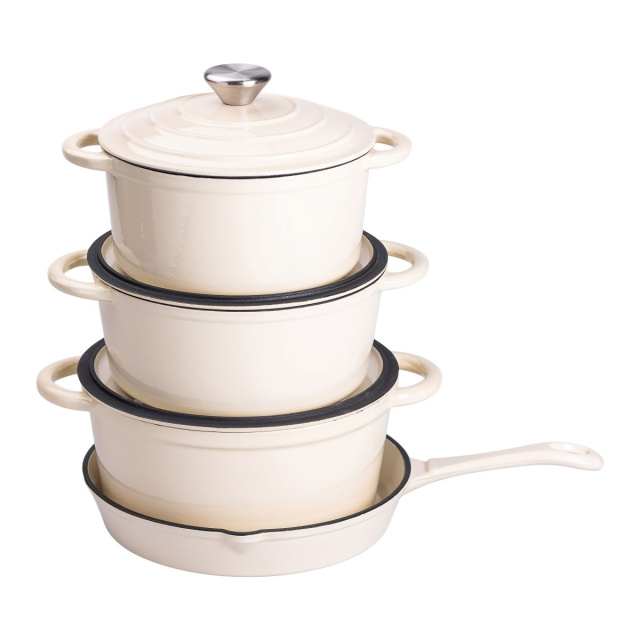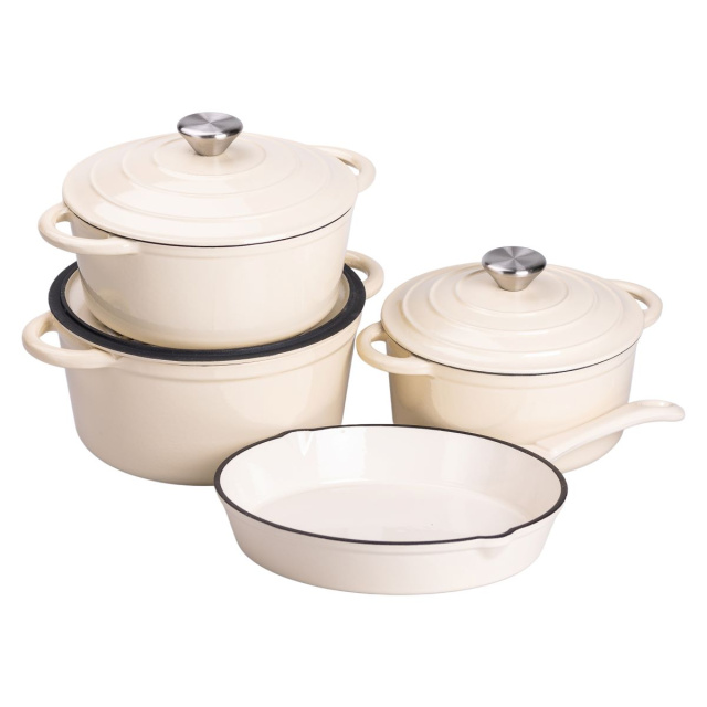 Набор чугунной посуды создан для тех, кто ценит качество и удобство в приготовлении пищи. В него входят три кастрюли объемом 2, 3 и 5 литров, а также компактная сковорода на 1 литр. Такой набор позволяет с легкостью готовить супы, рагу, мясные и овощные блюда, обеспечивая идеальное распределение тепла. Чугун отличается высокой теплоемкостью, что способствует равномерному прогреву продуктов и сохранению их естественного вкуса. Толстые стенки и дно предотвращают перегрев и обеспечивают стабильную температуру во время готовки. Литые ручки удобны в использовании и устойчивы к высоким температурам. Основные характеристики набора чугунной посуды с эмалированным покрытием Кастрюля на 2 литра Диаметр дна: 16,5 см; Высота кастрюли без крышки: 9,5 см; Высота кастрюли с крышкой: 16 см. Кастрюля на 3 литра Диаметр дна: 19 см; Высота кастрюли без крышки: 9 см; Высота кастрюли с крышкой: 16 см. Кастрюля на 5 литра Диаметр дна 21 см; Высота кастрюли без крышки: 11 см; Высота кастрюли с крышкой: 16 см. Сковорода на 1 литр Диаметр дна: 22 см; Высота сковороды с крышкой: 4 см. Посуда подходит для газовых и электрических плит, а также для приготовления на открытом огне, что делает ее отличным выбором как для кухни, так и для кулинарных экспериментов на природе. При правильном уходе чугун служит десятилетиями, не теряя своих свойств. Этот набор станет незаменимым помощником для любителей вкусных и насыщенных блюд, обеспечивая удобство и долговечность на долгие годы.