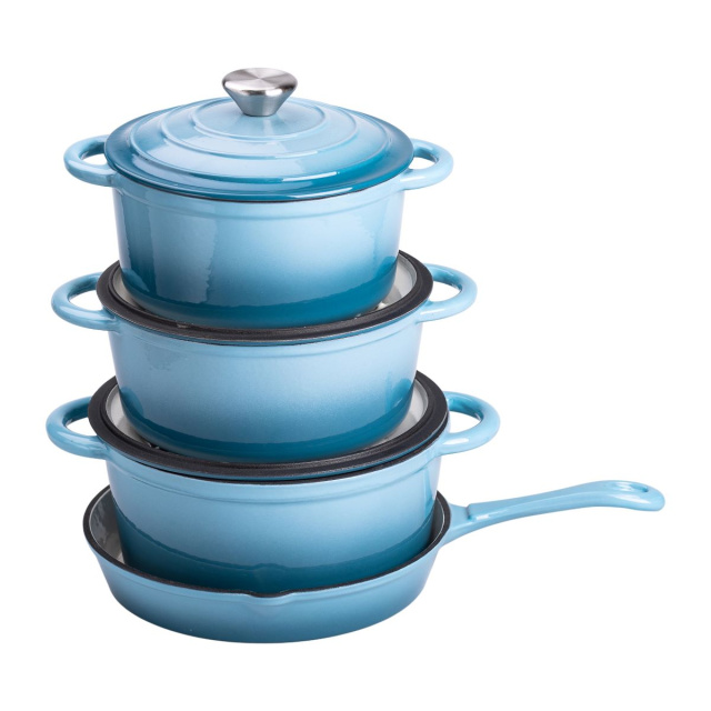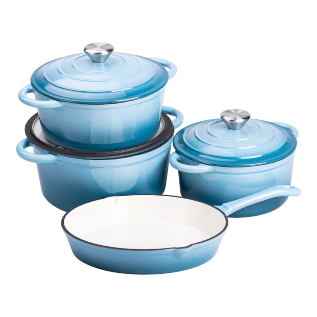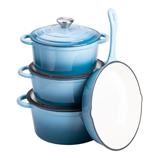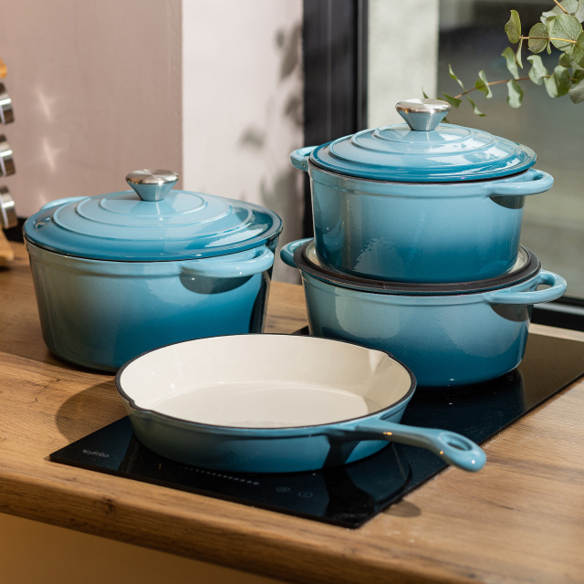 Набор чугунной посуды создан для тех, кто ценит качество и удобство в приготовлении пищи. В него входят три кастрюли объемом 2, 3 и 5 литров, а также компактная сковорода на 1 литр. Такой набор позволяет с легкостью готовить супы, рагу, мясные и овощные блюда, обеспечивая идеальное распределение тепла. Чугун отличается высокой теплоемкостью, что способствует равномерному прогреву продуктов и сохранению их естественного вкуса. Толстые стенки и дно предотвращают перегрев и обеспечивают стабильную температуру во время готовки. Литые ручки удобны в использовании и устойчивы к высоким температурам. Основные характеристики набора чугунной посуды с эмалированным покрытием Кастрюля на 2 литра Диаметр дна: 16,5 см; Высота кастрюли без крышки: 9,5 см; Высота кастрюли с крышкой: 16 см. Кастрюля на 3 литра Диаметр дна: 19 см; Высота кастрюли без крышки: 9 см; Высота кастрюли с крышкой: 16 см. Кастрюля на 5 литра Диаметр дна 21 см; Высота кастрюли без крышки: 11 см; Высота кастрюли с крышкой: 16 см. Сковорода на 1 литр Диаметр дна: 22 см; Высота сковороды с крышкой: 4 см. Посуда подходит для газовых и электрических плит, а также для приготовления на открытом огне, что делает ее отличным выбором как для кухни, так и для кулинарных экспериментов на природе. При правильном уходе чугун служит десятилетиями, не теряя своих свойств. Этот набор станет незаменимым помощником для любителей вкусных и насыщенных блюд, обеспечивая удобство и долговечность на долгие годы.