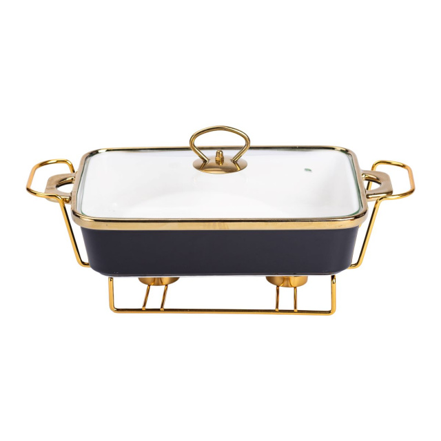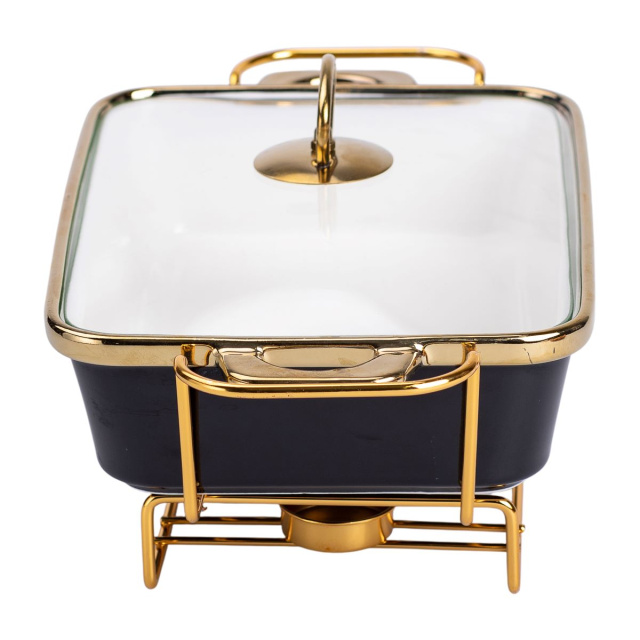 фарфоровый мармит со стеклянной крышкой на металлической подставке — отличное решение для банкетов и праздничных мероприятий. Металлическая подставка обеспечивает надежную фиксацию и удобство подачи блюд. Мармит поддерживает оптимальную температуру, сохраняя вкус и аромат пищи. Основные характеристики фарфорового мармита на подставке Размер: 35.5х19х15.5 см; Объем: 1.5 л; Материал мармита: фарфор; Материал крышки: стекло; Материал подставки: металл; Форма: прямоугольная. фарфоровый мармит является не только практичным, но и эстетически привлекательным выбором для любого стола, обеспечивая удобство во время сервировки блюд. Купить мармиты настольные с подогревом можно с доставкой по всей Украине.