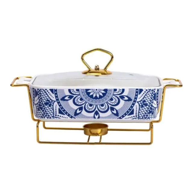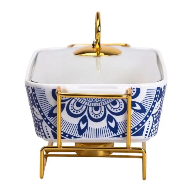 .фарфоровый мармит со стеклянной крышкой на металлической подставке — отличное решение для банкетов и праздничных мероприятий. Металлическая подставка обеспечивает надежную фиксацию и удобство подачи блюд. Мармит поддерживает оптимальную температуру, сохраняя вкус и аромат пищи. Основные характеристики фарфорового мармита на подставке Размер: 38х18.5х15.5 см; Объем: 1 л; Материал мармита: фарфор; Материал крышки: стекло; Материал подставки: металл; Форма: прямоугольная. фарфоровый мармит является не только практичным, но и эстетически привлекательным выбором для любого стола, обеспечивая удобство во время сервировки блюд. Купить мармиты настольные с подогревом можно с доставкой по всей Украине.