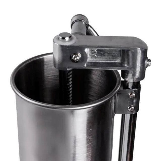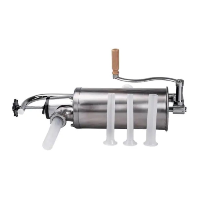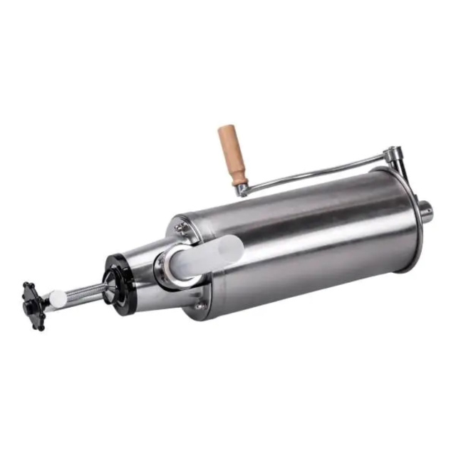 Шприц для колбасы – это надежное и удобное устройство для приготовления домашней колбасы и других мясных изделий. Колбасный шприц отличается высокой практичностью и простотой в использовании. Устройство имеет вертикальную конструкцию, благодаря чему процесс набивки мяса в оболочку становится быстрым и удобным. Мясо загружается в шприц без лишних усилий, а сам прибор надежно фиксируется на столе с помощью специального крепежного колеса (струбцины), что предотвращает его перемещение во время работы. Шприц для начинки колбасы оснащен различными насадками, что позволяет изменять диаметр колбасы в зависимости от потребностей пользователя. Насадки выполнены из прочного пластика, что гарантирует долговечность и легкость в уходе. Материал ручки – нержавеющая сталь с деревянными элементами, что обеспечивает удобство при эксплуатации и дополнительную стойкость устройства. Основные характеристики: Диаметр насадок: 18, 19, 21, 25 мм; Объем: 3 л; Высота: 53 см; Диаметр шприца: 13.5 см; Диаметр цилиндра: 12.5 см; Материал насадок: пластик; Материал ручки: нержавеющая сталь + дерево; Материал корпуса: нержавеющая сталь. Вертикальный колбасный шприц – это идеальный выбор для домашних кулинаров и профессионалов, которые ценят качество и удобство. Он позволяет создавать не только колбасы, но и другие мясные изделия, что делает его универсальным инструментом на кухне.