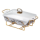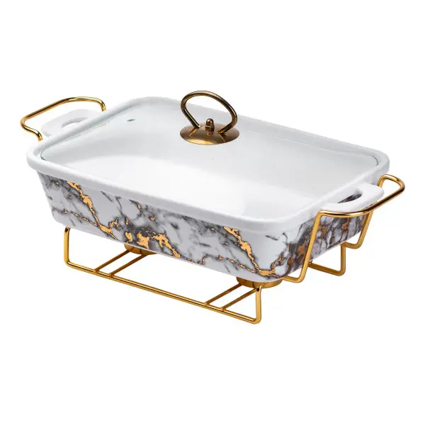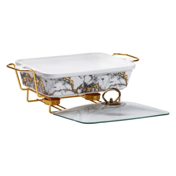 Настольная мармитница прямоугольная на металлической подставке станет идеальным выбором для любого банкета или праздничного мероприятия. Металлическая подставка обеспечивает надежную поддержку мармита и удобство при подаче блюд. Мармит используется для поддержания температуры блюд, сохраняя их аромат. Основные характеристики мармита: Объем: 1.5 литра; Размер: 35х19х11.5 см; Материал: фарфор; Материал: крышки стекло; Материал: подставки металл. фарфоровый мармит является не только практичным, но и эстетически привлекательным выбором для любого стола, обеспечивая удобство и стиль во время сервировки блюд. Купить мармит фарфоровый можно с доставкой по всей Украине.