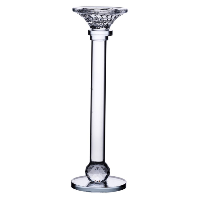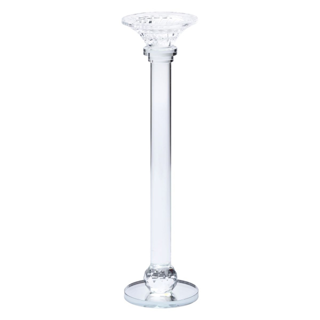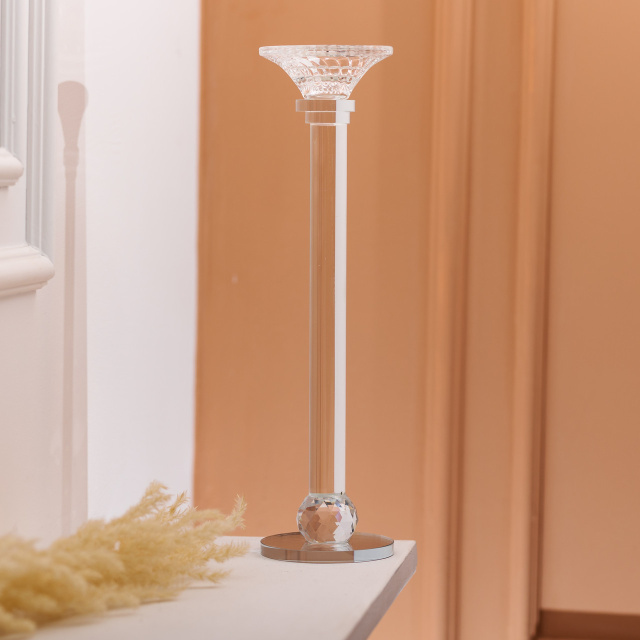 Этот элегантный стеклянный подсвечник привлекает внимание своей лаконичностью и утончённым дизайном. Вся конструкция выполнена из полностью прозрачного стекла, что придаёт изделию лёгкость и изысканность. Верхняя часть подсвечника — широкая гранёная чаша с чёткими геометрическими линиями, которая напоминает форму цветка или раскрытого кубка. Она красиво преломляет свет и придаёт свечению особый блеск. Центральная часть представляет собой тонкую цилиндрическую ножку, которая визуально вытягивает композицию и делает подсвечник особенно эффектным при групповой расстановке. Основные характеристики: Материал: стекло; Высота: 34 см; Диаметр: 9 см; Диаметр под свечу: 2 см / 5.5 см; Глубина: 2 см / 3 см; Цвет: прозрачный. Для чего подойдет? Декор дома – изящный элемент для гостиной, спальни или обеденной зоны. Романтическая атмосфера – мягкое мерцающее пламя в сочетании с изысканным стеклом создаст теплый уют. Сервировка стола – отлично впишется в праздничное убранство, будь то свадьба, юбилей или новогодний ужин. Подарок – стильный выбор для любителей утонченного интерьера. Этот подсвечник — воплощение утончённого стиля и сдержанной роскоши. Его можно использовать как самостоятельно, так и в сочетании с другими подсвечниками разной высоты для создания многослойной и выразительной композиции.