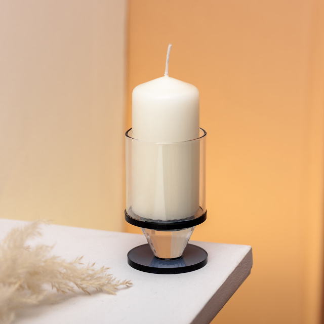 Этот декоративный стеклянный подсвечник выполнен в минималистичном и современном стиле. Он имеет цилиндрическую форму со строгими линиями, которая идеально подходит для интерьерных композиций в духе минимализма, скандинавского и современного дизайна. Основные характеристики: Материал: стекло; Высота: 10 см; Диаметр: 6 см; Диаметр под свечу: 5.4 см; Глубина: 5.5 см; Цвет: прозрачный черный. Идеально подойдёт для: Свечей-таблеток или небольших цилиндрических свечей; Современного или лофт-интерьера; Украшения журнального столика, подоконника, полки или ванной комнаты; Сервировки стола или вечернего декора с приглушённым освещением; Подарка в стиле «лаконичная эстетика». Этот подсвечник — сочетание функциональности и эстетики. Его сдержанный, но выразительный дизайн отлично впишется в стильный интерьер и подчеркнёт вкус владельца. Компактный, но эффектный, он будет уместен как самостоятельный элемент декора, так и в составе композиции с другими предметами.