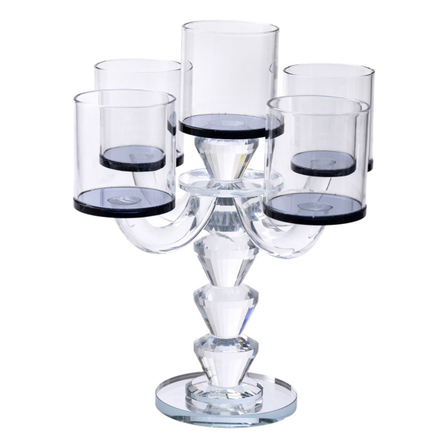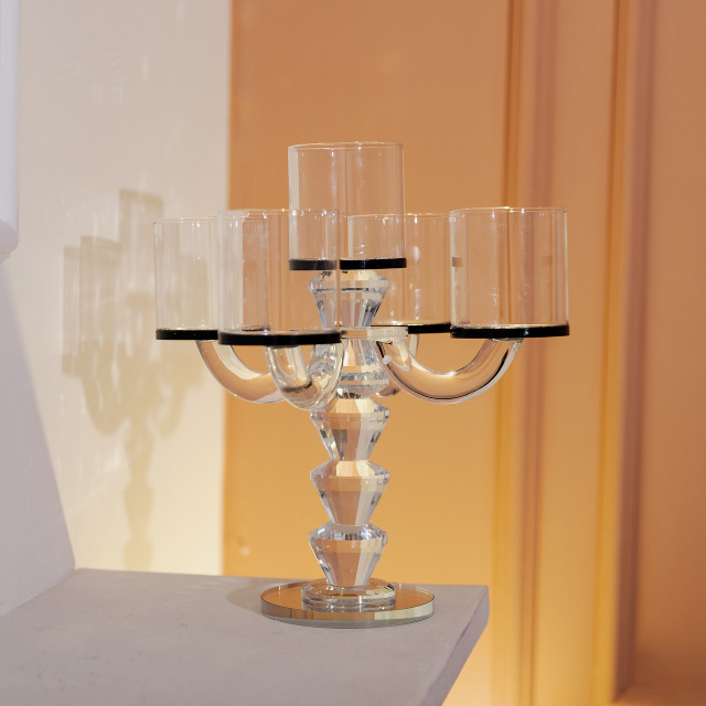 Утончённый стеклянный канделябр на пять свечей станет элегантным элементом декора в современном интерьере. Прозрачные цилиндрические колбы, расположенные на плавно изогнутых держателях, подчёркивают простоту форм и изысканность композиции. Зеркальное основание и контрастные акценты создают эффект глубины и отражения, усиливая визуальное восприятие. Основные характеристики канделябра: Материал: стекло; Размер: 19×19×24 см; Глубина подсвечника: 5.4 см; Диаметр под свечу: 5.7 см. Особенности стеклянного подсвечника на 5 свечей: Контраст чёрных и прозрачных элементов добавляет глубины; Идеально подходит для свадеб, банкетов, фотозон; Легко комбинируется с другими элементами декора. Этот стеклянный канделябр на пять свечей — идеальный выбор для тех, кто ценит лаконичный стиль и элегантные акценты. Он гармонично дополнит как повседневный интерьер, так и праздничную сервировку, придавая пространству уют и нотку утончённости.