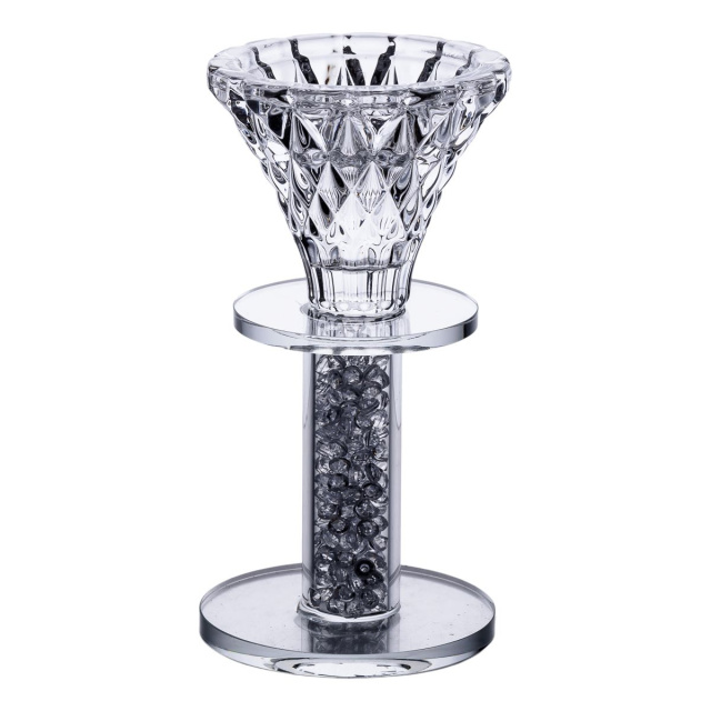 Изысканный стеклянный подсвечник, сочетающий оригинальный дизайн с практичностью. Верхняя часть выполнена в форме глубокой чаши с геометрическим рельефом, напоминающим огранённый кристалл. Она эффектно преломляет свет и делает пламя свечи особенно выразительным. Ножка — цилиндрическая, прозрачная, с внутренним наполнением из стеклянных бусин, которые красиво мерцают и создают ощущение лёгкости и блеска. Основание и верхняя опора выполнены в виде гладких стеклянных дисков. Дизайн подсвечника легко впишется в интерьер в стиле классика, прованс или минимализм — он смотрится эффектно как самостоятельный элемент, так и в паре с другими подсвечниками разной высоты. Благодаря прозрачности и сиянию стекла, он подчёркивает красоту горящей свечи и создаёт атмосферу тепла и уюта. Основные характеристики: Материал: стекло; Высота: 12 см; Диаметр: 6 см; Диаметр под свечу: 2 см; Глубина: 2 см; Цвет: прозрачный. Применение: Отлично подойдёт для свечей-таблеток или небольших цилиндрических свечей; Может использоваться как самостоятельный декор или в композициях из нескольких подсвечников разной высоты; Идеален для сервировки праздничного стола, свадеб, романтических вечеров или оформления интерьера в классическом и винтажном стиле. Этот стеклянный подсвечник на короткой ножке — это сочетание утончённого дизайна и практичности. Благодаря своему компактному размеру и выразительной форме он легко впишется как в торжественную обстановку, так и в повседневный уютный интерьер.