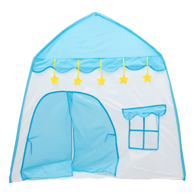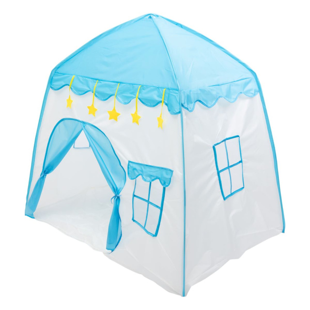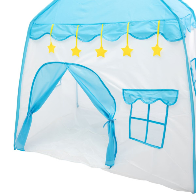 Эта очаровательная игровая палатка станет любимым уголком для вашего ребенка! Просторная, уютная и оформленная в нежных тонах, она создаст сказочную атмосферу для веселых игр. Благодаря легкому каркасу и прочному 100% полиэстеру, палатка устойчива к влаге и ультрафиолетовым лучам, поэтому её можно устанавливать как в помещении, так и на улице — в саду или на пикнике. Палатка выполнена в нежно-голубых оттенках с декоративными элементами — звездочками, волнистыми краями и окошками с красивыми "ставнями". Основные характеристики: Размеры в сложенном виде: 53×23×4 см; Размеры в разложенном виде: 125×100×120 см; Материал: 100% полиэстер; Количество окон: 3; Закрывающийся вход: шторки на завязках; Легкая сборка и разборка. Палатка быстро собирается и разбирается, не требуя специальных инструментов. Компактные размеры в сложенном виде (53×23×4 см) позволяют удобно хранить и транспортировать её. Подарите ребенку собственное волшебное пространство для игр и отдыха! Эта нежная и просторная игровая палатка станет его любимым местом для веселья, фантазий и уединения. Благодаря стильному дизайну с звездочкам, декоративными воланами и окошками с занавесками, палатка выглядит как настоящий сказочный домик.
