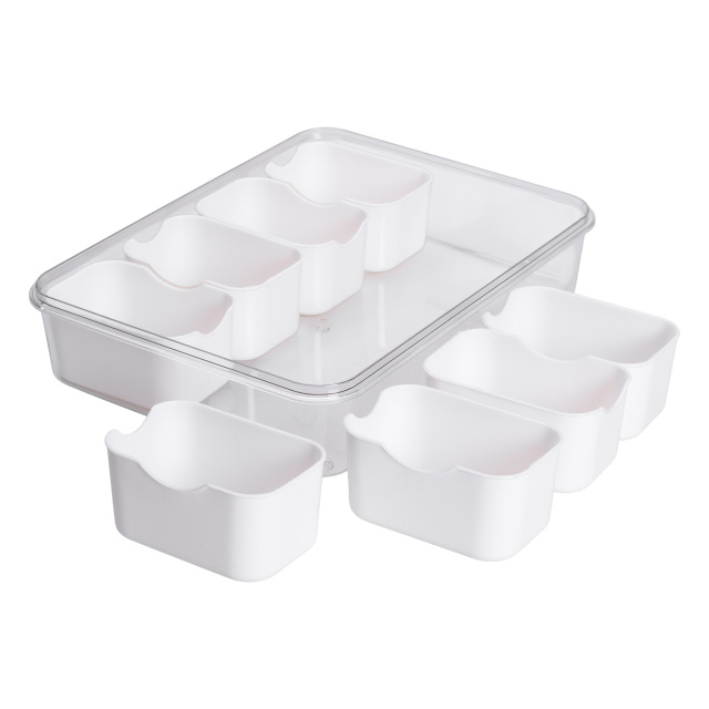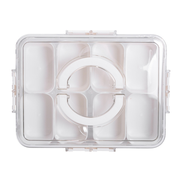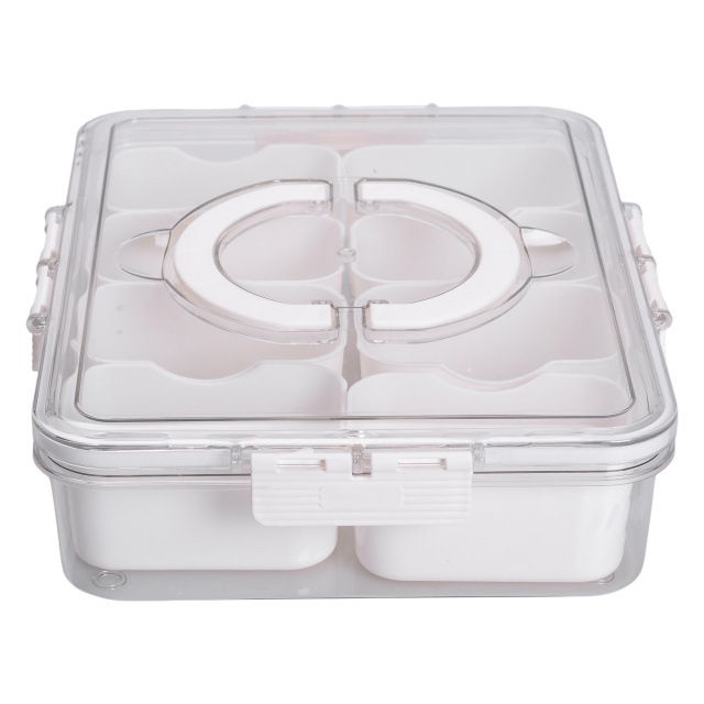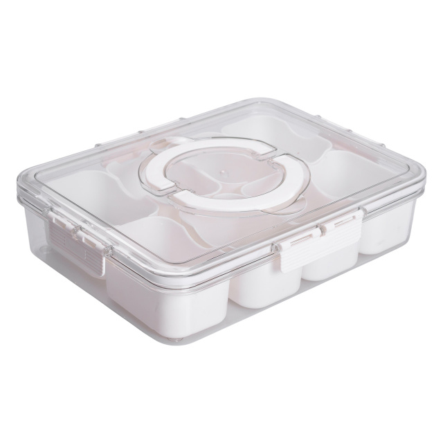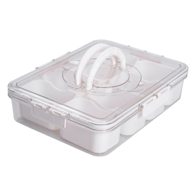 Универсальный пластиковый контейнер с 8 отдельными отсеками идеально подходит для организации и хранения мелких продуктов, приправ, закусок или сухофруктов. Каждый отсек имеет четко очерченную форму, что позволяет удобно сортировать содержимое, а прозрачная верхняя крышка с фиксаторами обеспечивает герметичность и защиту от влаги и пыли. В центре контейнера размещена съемная круглая секция, что добавляет вариативности в использовании. Основные характеристики: Размер: 31х24х7 см; Внутренний размер: 28.5х21.5х5.5 см; Размер отсека: 10х6.5х5 см; Объем: 2.5 л; Количество отсеков: 8 шт; Материал: пластик. Практичная крышка оснащена двумя удобными ручками для комфортной переноски. Контейнер выполнен из безопасного для пищевых продуктов пластика, который не впитывает запахи и легко моется. Благодаря продуманной форме и небольшой высоте контейнер удобно хранить в кухонных шкафчиках, ящиках или холодильнике. Этот контейнер пригодится для упорядочения кухонного пространства или организации продуктов в дороге. Его можно использовать не только дома, но и для пикников, поездок или офисных перекусов. Практичность, разделение на 8 секций и плотное закрытие обеспечивают чистоту и сохранность содержимого.