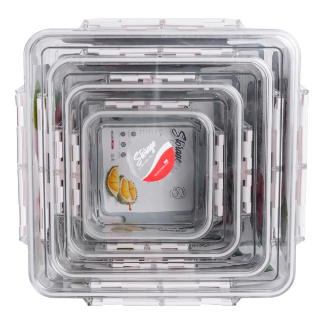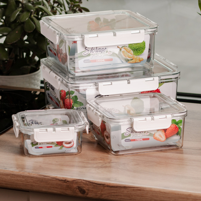 Универсальный и практичный набор пластиковых контейнеров для хранения продуктов. Идеально подойдёт для кухни, холодильника, пикников, заморозки или повседневного использования. Прочные пластиковые стенки и герметичные крышки на защёлках обеспечивают длительное хранение без запахов и протеканий. Основные характеристики: Материал: пластик; Тип крышек: герметичные, с надёжными защёлками по бокам; Количество в наборе: 4 шт. Объём и размер: 700 мл – 13×13×5 см; 1.7 л – 16.5×16.5×6.5 см; 3.3 л – 21×21×8 см; 5.7 л – 25×25×10 см. Особенности: Герметичность — защёлки плотно фиксируют крышку, предотвращая пролив; Прозрачные стенки — удобно видеть содержимое; Компактно складываются друг в друга для хранения; Идеальны для хранения еды, закусок, соусов, фруктов, овощей, круп и т. д.. Этот набор контейнеров для еды станет незаменимым помощником на кухне. Благодаря герметичным крышкам, различным объёмам и прочному материалу, вы легко сохраните свежесть продуктов и сэкономите пространство. Отличное решение для дома, офиса, пикников и хранения заготовок.