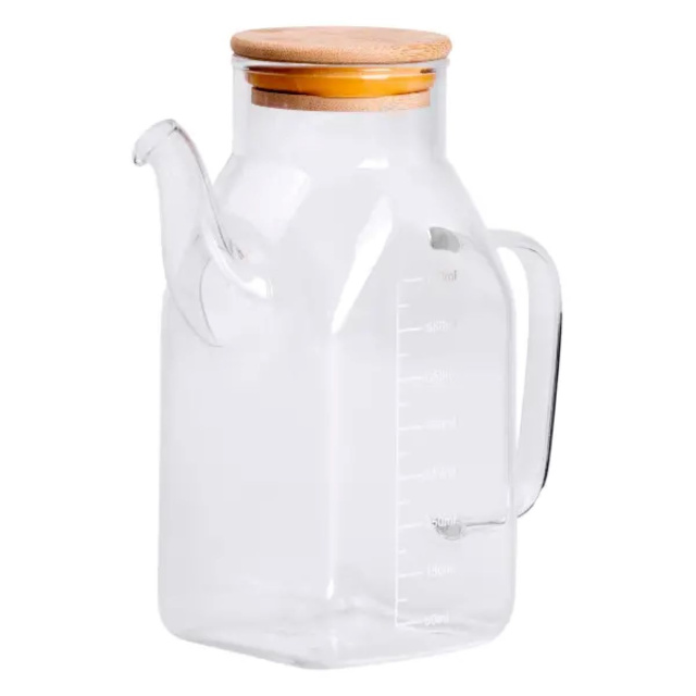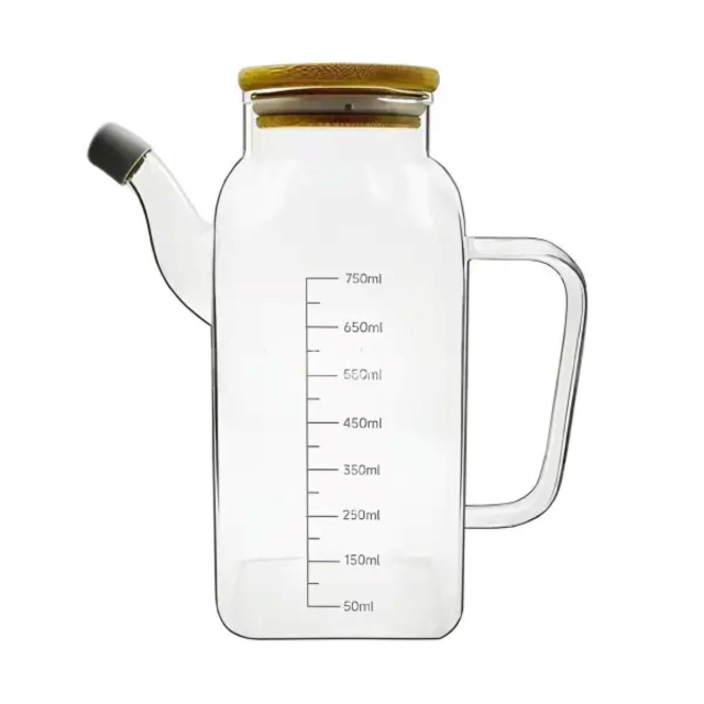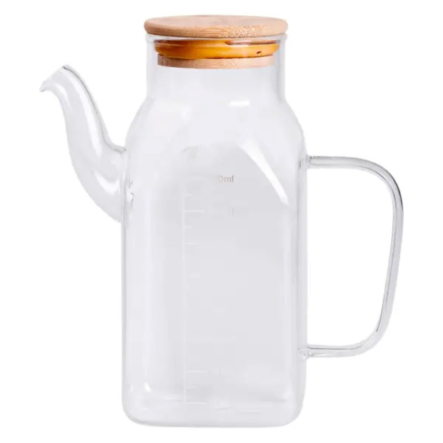 Чайник с мерной шкалой для масла и уксуса изготовлена из прозрачного боросиликатного стекла, устойчивого к перепадам температур и не впитывает запахов. Оснащен удобной ручкой и плотно закрывающейся крышкой, которая защищает содержимое от пыли. Основные характеристики: Объем: 750 мл; Размеры: 8×8×18.5 см; Верхний диаметр: 6 см; Нижний размер: 8×8 см; Материал бутылки: стекло; Материал крышки: бамбук. Особенности: Широкое горлышко облегчает наполнение и мытьё; Наличие мерной шкалы позволяет точно дозировать объем; Универсальный дизайн впишется в интерьер любой кухни; Удобна в ежедневном использовании. Благодаря устойчивой основе емкость для масла стабильно стоит на любой поверхности, предотвращая случайное опрокидывание. Эргономичная форма обеспечивает комфортное наливание, а боросиликатное стекло позволяет видеть уровень и качество содержимого. Идеально подходит для ежедневного использования на кухне - как в домашних условиях, так и в профессиональной сфере. Можно использовать для подачи оливкового масла, уксуса, соевого соуса или других жидкостей. Практична в уходе, легко моется вручную или в посудомоечной машине.