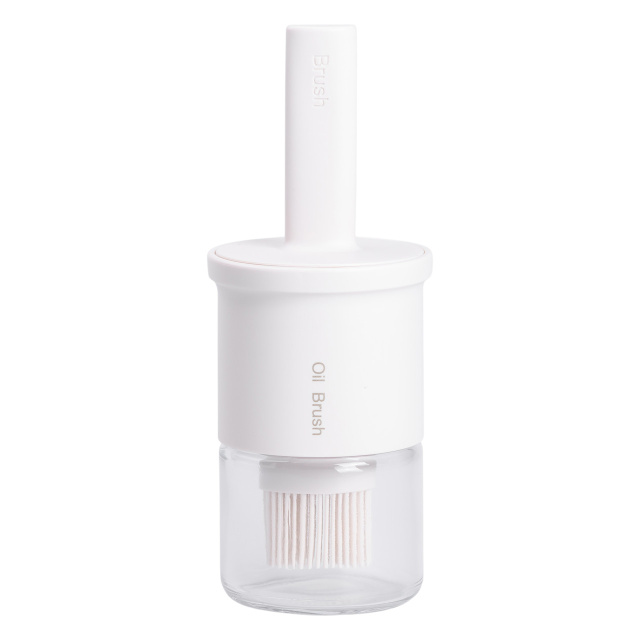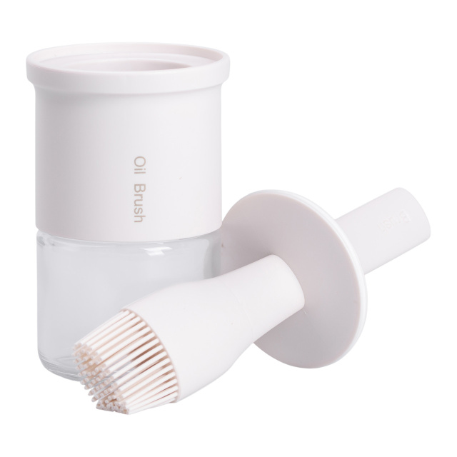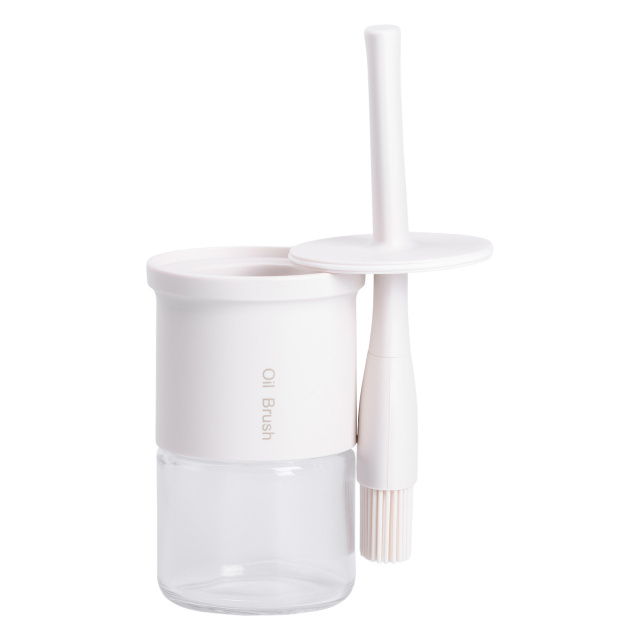 Стеклянная банка для масла 2 в 1 с силиконовой кисточкой и герметичной крышкой Банка для масла объединяет функцию хранения и нанесения благодаря интегрированной силиконовой кисточке, которая совмещена с крышкой. Такой формат позволяет быстро открыть бутылку, набрать необходимое количество масла и нанести его кисточкой без необходимости в дополнительной посуде. Силиконовая головка с гибкими щетинками устойчива к температурам до 230°C, поэтому удобно использовать ее во время жарки, запекания или смазывания формы для выпекания. Характеристики банки для подсолнечного масла с силиконовой кисточкой: Объем: 300 мл; Высота: 19 см; Диаметр: 6.5 см; Материал: стекло, пластик, силикон. Особенности диспенсера для оливкового масла: Удобная силиконовая кисть — позволяет равномерно наносить масло или соус на сковороду, противень, мясо или выпечку без капель и разбрызгивания. Герметичная крышка с двойным уплотнением — предотвращает протекание и сохраняет содержимое чистым. Плотное прилегание кисти — защищает от попадания пыли и загрязнений. Можно использовать в микроволновке — удобно для растапливания масла прямо в баночке. Простота в уходе — легко разбирается и подходит для мытья в посудомоечной машине. Безопасные материалы — изготовлена из пищевого пластика и силикона, не впитывает запахов и не влияет на вкус продуктов. Компактный размер — не занимает много места, всегда под рукой возле плиты. Применение емкости для масла с кисточкой-дозатором: Смазывание сковороды или противня — нанесите нужное количество масла на поверхность без лишнего расхода и капель. Идеально для жарки яиц, оладий, блинов и других блюд. Маринование мяса и овощей — с помощью кисточки легко и равномерно распределить маринад по продуктам, не пачкая руки и посуду. Приготовление выпечки — удобно наносить взбитое яйцо, молоко или сливки на булочки, слойки и пироги перед выпеканием для красивой золотистой корочки. Гриль и барбекю — при нанесении масла или маринада на стейки, курицу или овощи на решетке гриля, кисть обеспечивает равномерное покрытие без капель и ожогов. Использование на детской кухне — удобно при приготовлении детского питания, где важна точность дозировки и чистота. Стеклянная основа не впитывает запахов и позволяет контролировать уровень жидкости, а пластиковая крышка со встроенной силиконовой кисточкой плотно закрывается. Двойное силиконовое кольцо создает герметичное уплотнение, предотвращая протекание даже при наклоне. Бутылка удобна для бытового использования на кухне, особенно во время приготовления блюд на сковороде или гриле.