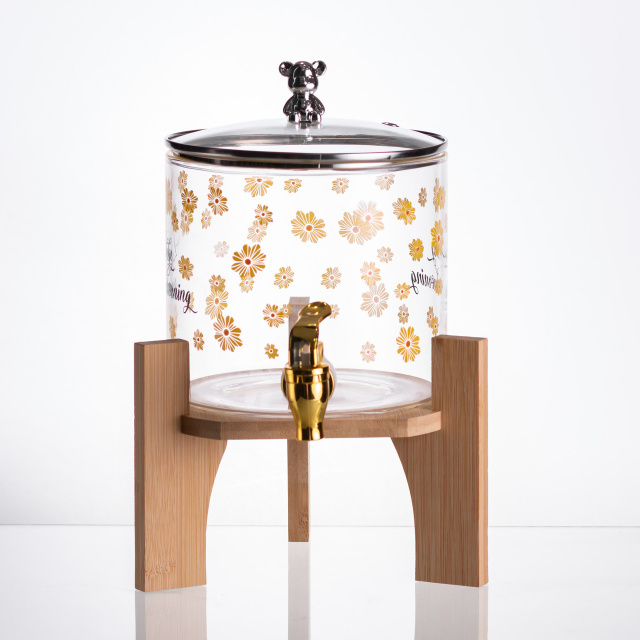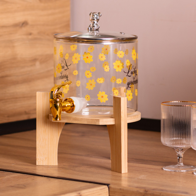 Лимонадница предназначена для удобного хранения и разлива охлажденных напитков. Основная емкость изготовлена из прозрачного стекла, что позволяет контролировать уровень напитка внутри. В нижней части расположен герметичный кран, который обеспечивает равномерную подачу жидкости без подтекания. Благодаря бамбуковой подставке лимонадница размещается на удобной высоте для наливания. Герметичная стеклянная крышка плотно закрывает горловину, предотвращая попадание пыли, насекомых и посторонних запахов. Ручка крышки выполнена в форме фигурки мишки - декоративный элемент, который добавляет индивидуальности изделию и привлекает внимание, особенно во время праздников или летних вечеринок. Лимонадница удобна для сервировки воды, лимонада, компота или холодного чая. Основные характеристики лимонадницы с краном: Материал лимонадницы: стекло; Материал подставки: дерево; Высота с подставкой: 29 см; Высота без подставки: 19 см; Диаметр: 15 см; Объем: 2.6 л. Особенности лимонадницы: Удобна для подачи напитков на пикниках, вечеринках и семейных праздниках. Легко наливает напиток одной рукой — подходит даже для детей. За счёт подставки можно ставить стаканы прямо под кран, без необходимости поднимать емкость. Не требует постоянного открывания крышки — напиток наливается через кран. Фигурная ручка делает лимонадницу привлекательной и оригинальной — можно использовать как элемент декора. Идеальна для летнего использования — напитки остаются защищёнными от насекомых. Легко мыть и собирать — минимум деталей и простой уход.
