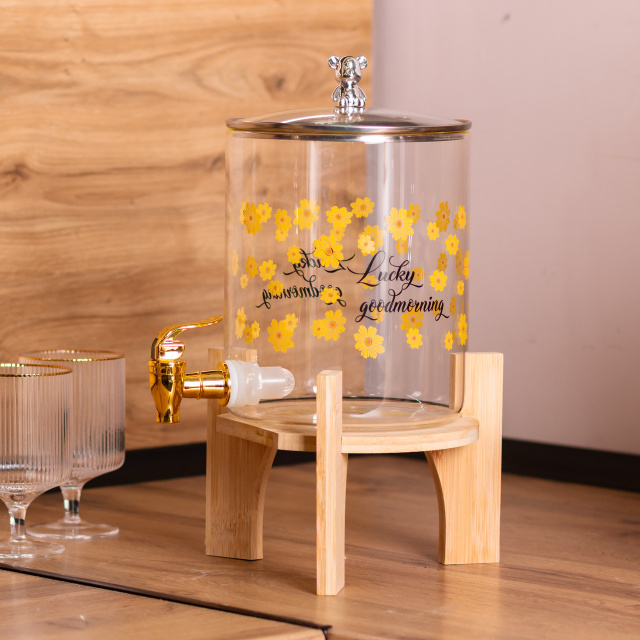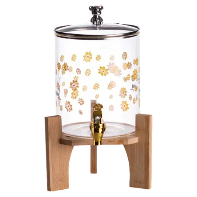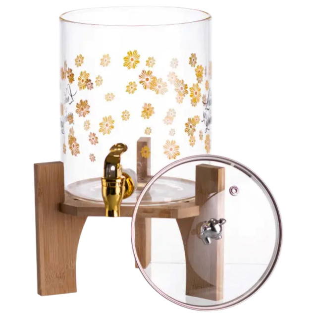 Лимонадница предназначена для удобного хранения и разлива охлажденных напитков. Основная емкость изготовлена из прозрачного стекла, что позволяет контролировать уровень напитка внутри. В нижней части расположен герметичный кран, который обеспечивает равномерную подачу жидкости без подтекания. Благодаря бамбуковой подставке лимонадница размещается на удобной высоте для наливания. Герметичная стеклянная крышка плотно закрывает горловину, предотвращая попадание пыли, насекомых и посторонних запахов. Ручка крышки выполнена в форме фигурки мишки - декоративный элемент, который добавляет индивидуальности изделию и привлекает внимание, особенно во время праздников или летних вечеринок. Лимонадница удобна для сервировки воды, лимонада, компота или холодного чая. Основные характеристики лимонадницы с краном: Материал лимонадницы: стекло; Материал подставки: дерево; Высота с подставкой: 34 см; Высота без подставки: 19 см; Диаметр: 15.5 см; Объем: 3.6 л. Особенности лимонадницы: Удобна для подачи напитков на пикниках, вечеринках и семейных праздниках. Легко наливает напиток одной рукой — подходит даже для детей. За счёт подставки можно ставить стаканы прямо под кран, без необходимости поднимать емкость. Не требует постоянного открывания крышки — напиток наливается через кран. Фигурная ручка делает лимонадницу привлекательной и оригинальной — можно использовать как элемент декора. Идеальна для летнего использования — напитки остаются защищёнными от насекомых. Легко мыть и собирать — минимум деталей и простой уход.