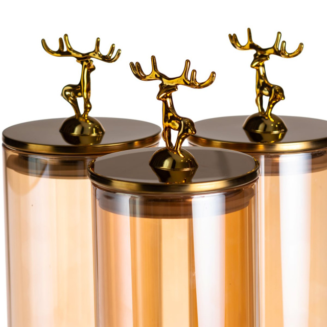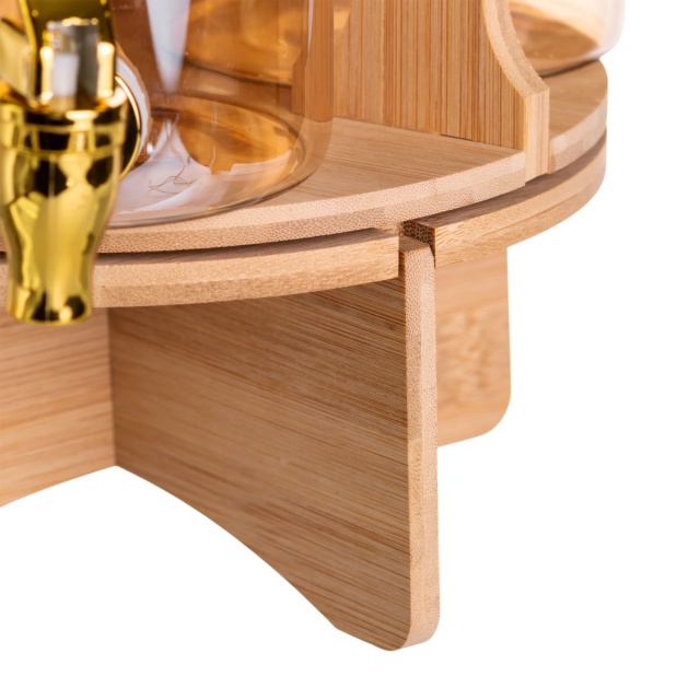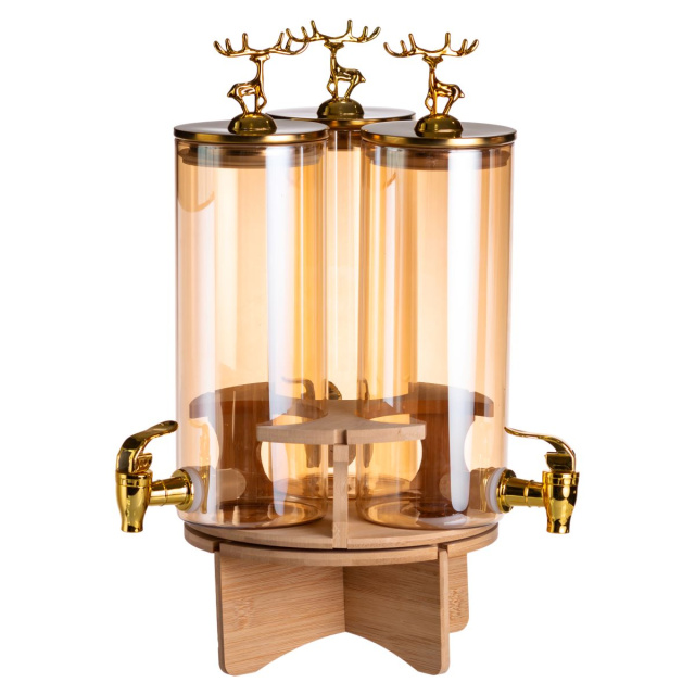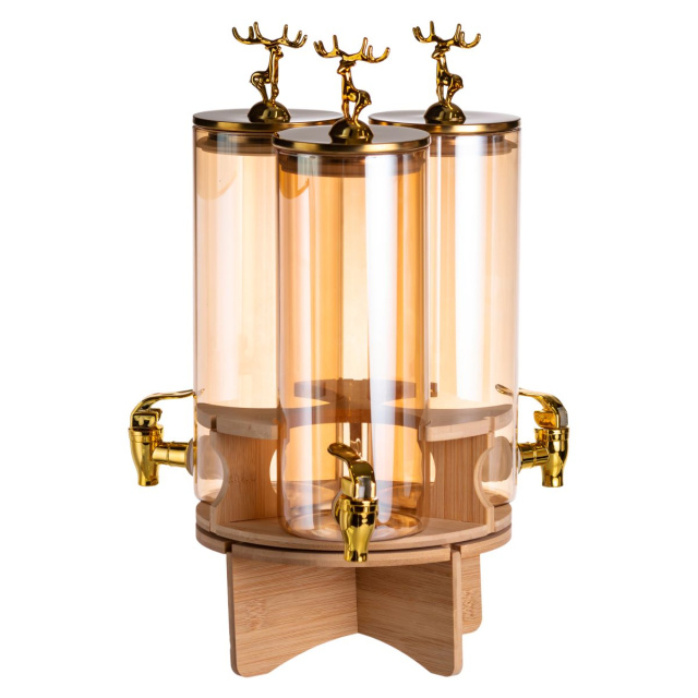 Изысканная стеклянная лимонадница 3в1 объёмом 5.5 литра — идеальный выбор для стильной подачи напитков на фуршетах, банкетах, вечеринках и домашних встречах. Три отдельные ёмкости позволяют подавать сразу несколько видов напитков, фруктовой воды или домашнего лимонада. Декоративные крышки с золотыми оленями и краники под золото придают сервировке премиальный и праздничный вид. Прочная деревянная подставка делает конструкцию устойчивой и эстетичной. Характеристики лимонадницы 3в1 общий объём: 5.5 литра; количество ёмкостей: 3 шт.; объём одной колбы: ~1.7 л; диаметр каждой ёмкости: 9.5 см; общий диаметр лимонадницы: 21 см; высота с крышками: 40 см; материал колб: термостойкое стекло; материал крышек и кранов: металл с золотистым покрытием; подставка: натуральное дерево, поворотная конструкция. Лимонадница отлично подойдёт для соков, компотов, воды с цитрусами, ягодных напитков и авторских настоек. Каждая ёмкость имеет собственный кран, что обеспечивает удобство в использовании. Поворотная деревянная основа облегчает доступ к любой из ёмкостей и делает подачу максимально комфортной. Преимущества лимонадницы на 3 секции 3 отдельных колбы — подача разных напитков в одном оформлении. Премиальный внешний вид — эффектные золотые крышки с оленями и фурнитура. Термостойкое стекло — сохраняет вкус напитков, легко моется. Компактная круглая форма — занимает минимум места на столе. Идеальна для мероприятий, кейтеринга, кафе и подарков. Купить стеклянную лимонадницу 3в1 с золотыми деталями и деревянной подставкой можно с доставкой по всей Украине. Безопасная упаковка гарантирует сохранность при транспортировке. Превратите каждую подачу напитков в событие.