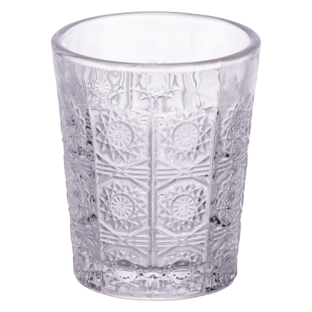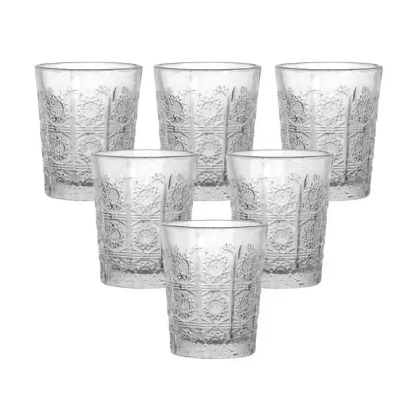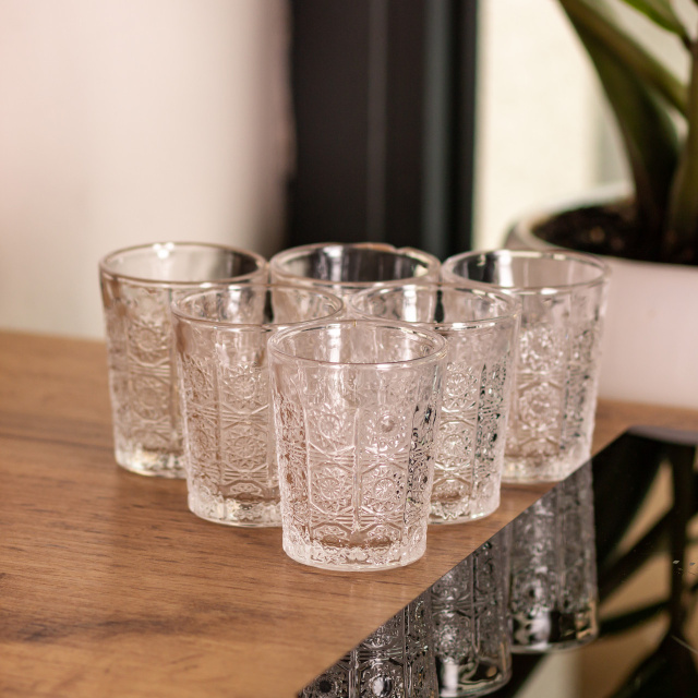 Набор стопок изготовлен из толстого прозрачного стекла, что обеспечивает прочность и длительный срок службы. Изделия имеют классическую цилиндрическую форму с низким профилем, удобно лежат в руке и отличаются простотой и лаконичностью дизайна. Поверхность изделий украшена рельефным узором в виде стилизованного подсолнуха. Основные характеристики набора рюмок материал: стекло; объем: 50 мл; верхний диаметр: 4.5 см; нижний диаметр: 4 см; высота: 6 см. Особенности набора стопок универсальны для подачи водки, настоек, ликеров и других крепких напитков; компактная форма удобна в использовании и хранении; толщина стекла делает стопки прочными и устойчивыми к сколам; лаконичный дизайн подходит под любой стиль сервировки; легко очищаются, можно мыть в посудомоечной машине; подойдут как для домашнего использования, так и для сервиса в заведениях. Благодаря толстому дну рюмки остаются устойчивыми даже на гладких поверхностях и помогают сохранять температуру напитков дольше. Прозрачное стекло не искажает цвет содержимого, поэтому напитки выглядят естественно и привлекательно на сервировке. Такой набор станет уместным как для домашнего использования, так и для праздничных событий. Стопки легко моются вручную или в посудомоечной машине, не впитывают запахов и не мутнеют со временем.