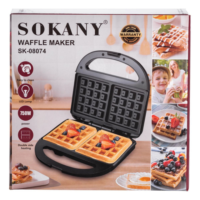 Электрическая вафельница Sokany SK-08074 — это простое и удобное решение для приготовления вкусных бельгийских вафель у себя дома. Мощность 750 Вт, двойной нагрев и антипригарная поверхность обеспечивают быструю и безопасную готовку. Благодаря стильному дизайну и компактным размерам она станет незаменимым помощником на вашей кухне. Характеристики вафельницы Sokany SK-08074 тип устройства: вафельница электрическая; мощность: 750 Вт; размер: 22×21×6.5 см; размер пластин: 21×11.5 см; длина шнура питания: 0.6 м; форма вафель: квадратная (на 2 вафли); тип нагрева: двухсторонний (равномерный); антипригарное покрытие: есть; индикаторы: LED-индикатор нагрева и готовности; цвет корпуса: чёрный, компактный дизайн; упаковка: фирменная коробка Sokany. Преимущества вафельницы Sokany SK-08074 Готовит вкусные вафли всего за 3–5 минут. Антипригарное покрытие упрощает уход и предотвращает пригорание. Нагрев с двух сторон — вафли пропекаются равномерно и быстро. Индикаторы подскажут, когда прибор готов к работе. Лёгкая, компактная и удобная для хранения даже в маленькой кухне. Идеальный выбор для ситуаций с отключением газа, ограниченным пространством или быстрой готовкой. Работает от стандартной розетки 220 В, не требует дополнительных настроек или аксессуаров. Купить вафельницу Sokany SK-08074 можно с доставкой по всей Украине. Отправляем в день заказа, надёжная упаковка, оплата при получении, гарантия от производителя.