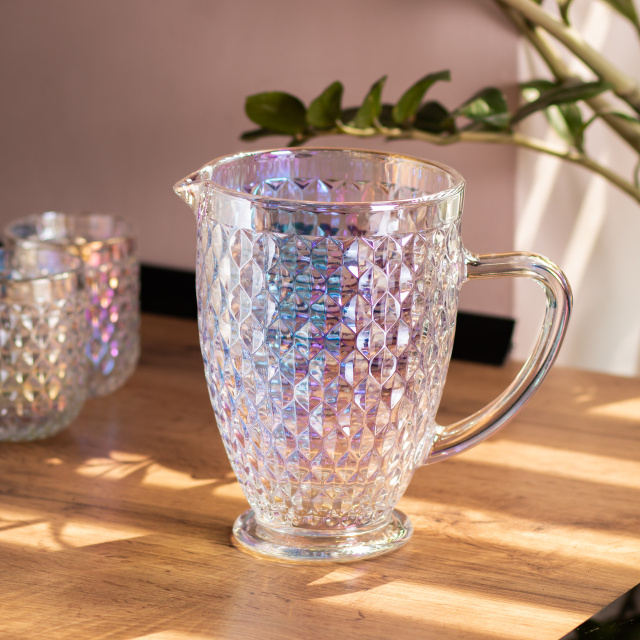Кувшин для напитков изготовлен из прозрачного стекла и имеет фигурную форму с декоративными изгибами. Благодаря прозрачности материала хорошо видно содержимое, что позволяет эффектно подавать воду, компоты, соки или другие напитки. Конструкция дополнена удобной стеклянной ручкой, которая гармонично сочетается с формой кувшина и обеспечивает комфортное содержание. Основные характеристики кувшина для напитков: Объем: 1.2 литра; Диаметр: 13 см; Высота: 18.5 см; Материал: стекло; Назначение: вода, соки, лимонад, компот, молоко, чай, охлажденные напитки. Форма кувшина разработана таким образом, чтобы облегчить наливание жидкости без разбрызгивания. Широкое горло позволяет удобно добавлять кусочки фруктов, трав или лед для приготовления охлажденных напитков. Толстое стекло повышает прочность изделия и делает его пригодным для повседневного использования. Кувшин идеально подходит для использования дома, в кафе или на праздничном столе. Его можно мыть вручную или в посудомоечной машине. Посуда, которая сочетает функциональность и привлекательный вид для ежедневной и особой сервировки.