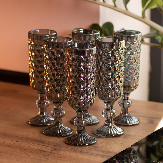 Набор бокалов для шампанского — практичное и стильное решение для подачи игристых напитков, коктейлей или воды как дома, так и в заведениях общественного питания. Бокалы изготовлены из прочного стекла с лёгким серым оттенком и рельефной вертикальной текстурой. Такая поверхность не только придаёт оригинальный внешний вид, но и делает использование более удобным — бокалы не скользят в руках даже при влажности. Основные характеристики набора бокалов для шампанского Набор: 6 штук; Объем: 160 мл; Высота: 18 см; Верхний диаметр: 5 см; Нижний диаметр: 6 см; Материал: стекло. Этот набор бокалов для шампанского станет удачным выбором для тех, кто ценит сочетание стиля, удобства и качества. Благодаря универсальному дизайну и прочному исполнению, бокалы подойдут как для повседневного использования, так и для особых случаев. Они не только украсят ваш стол, но и сделают каждую встречу с близкими ещё более тёплой и запоминающейся.