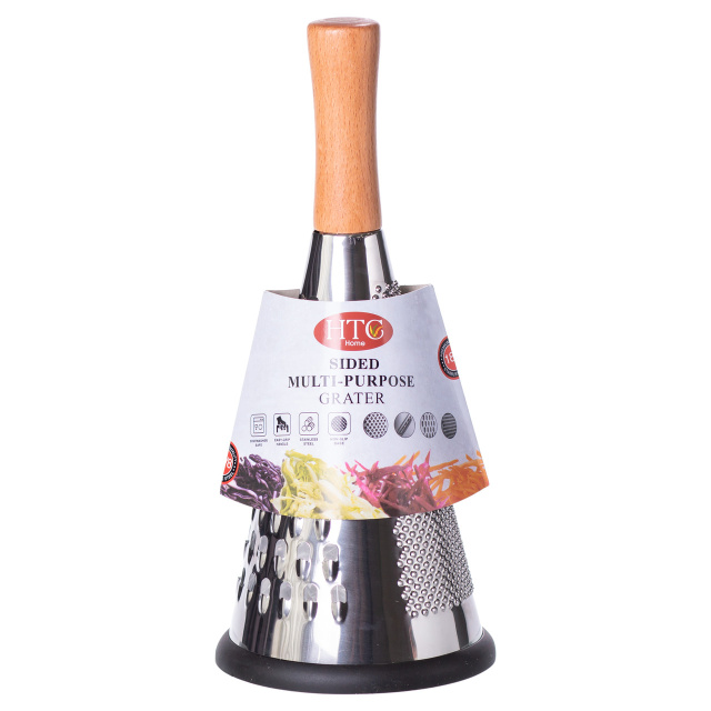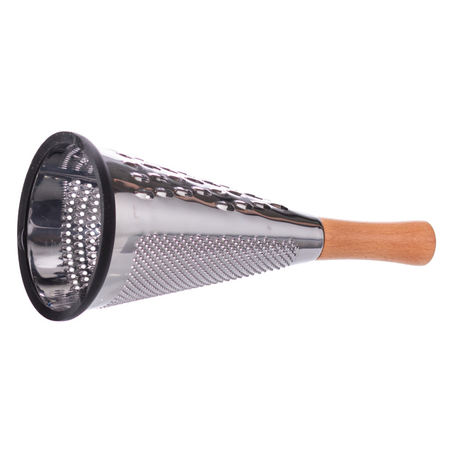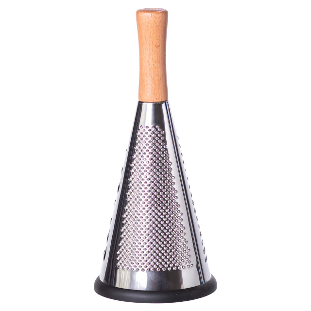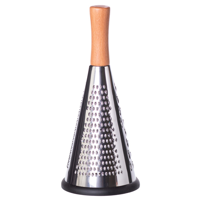 Конусная трёхсторонняя тёрка с деревянной ручкой — удобный и стильный кухонный аксессуар для быстрого измельчения овощей, сыра, фруктов, шоколада и других продуктов. Оснащена тремя рабочими поверхностями с разной структурой лезвий, что позволяет натирать продукты крупно, мелко или нарезать тонкими ломтиками. Универсальная форма делает тёрку подходящей как для домашнего, так и для профессионального использования. Корпус изготовлен из прочной нержавеющей стали, устойчивой к коррозии и прост в уходе. Эргономичная ручка выполнена из натурального дерева — она не нагревается, приятно лежит в руке и придаёт изделию эстетичный внешний вид. Классический дизайн без лишних деталей позволяет быстро мыть её вручную или в посудомоечной машине. Основные характеристики конусной ручной терки из нержавейки: Материал терки: нержавеющая сталь; Материал ручки: дерево; Диаметр: 12 см; Высота: 27.5 см; Количество рабочих сторон: 3; Ширина рабочей поверхности: 6 см; Длина рабочей поверхности: 13см; Противоскользящее основание: есть. Особенности металлической терки для овощей: 3 рабочие поверхности; Корпус из нержавеющей стали — не ржавеет, не впитывает запахи; Эргономичная деревянная ручка — удобный и безопасный захват; Подходит для мытья в посудомоечной машине; Идеальна для твердого сыра, овощей, фруктов. Эта многофункциональная терка станет незаменимым помощником на вашей кухне. Она сочетает в себе удобство, продуманный дизайн и качество материалов, обеспечивая лёгкость в приготовлении различных блюд. Надёжная, компактная и простая в уходе — идеальный выбор для тех, кто ценит практичность и комфорт в каждом кухонном аксессуаре.