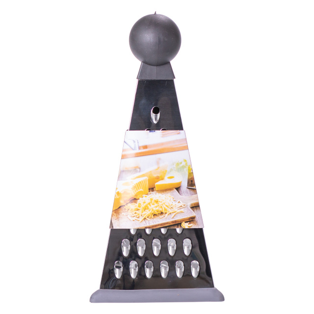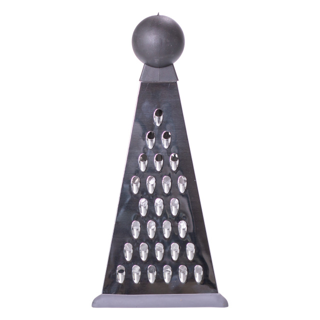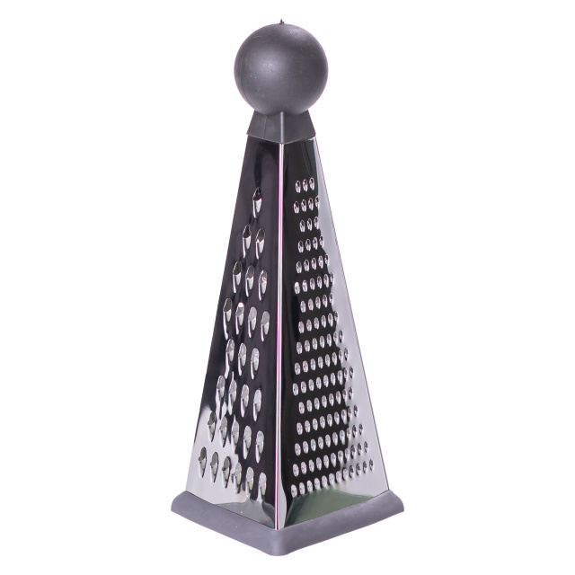 .Конусная трёхсторонняя тёрка с ручкой — удобный и стильный кухонный аксессуар для быстрого измельчения овощей, сыра, фруктов, шоколада и других продуктов. Оснащена тремя рабочими поверхностями с разной структурой лезвий, что позволяет натирать продукты крупно, мелко или нарезать тонкими ломтиками. Универсальная форма делает тёрку подходящей как для домашнего, так и для профессионального использования. Корпус изготовлен из прочной нержавеющей стали, устойчивой к коррозии и прост в уходе. Эргономичная ручка выполнена из пластика — она приятно лежит в руке и придаёт изделию эстетичный внешний вид. Классический дизайн без лишних деталей позволяет быстро мыть её вручную или в посудомоечной машине. Основные характеристики конусной ручной терки из нержавейки: Материал терки: нержавеющая сталь; Материал ручки: нержавеющая сталь с прорезиненным покрытием; Размер: 11×11×23 см; Количество рабочих сторон: 3; Ширина рабочей поверхности: 7 см; Длина рабочей поверхности: 14 см; Противоскользящее основание: есть. Особенности металлической терки для овощей: 3 рабочие поверхности; Корпус из нержавеющей стали — не ржавеет, не впитывает запахи; Эргономичная ручка — удобный и безопасный захват; Подходит для мытья в посудомоечной машине; Идеальна для твердого сыра, овощей, фруктов. Эта многофункциональная терка станет незаменимым помощником на вашей кухне. Она сочетает в себе удобство, продуманный дизайн и качество материалов, обеспечивая лёгкость в приготовлении различных блюд. Надёжная, компактная и простая в уходе — идеальный выбор для тех, кто ценит практичность и комфорт в каждом кухонном аксессуаре.