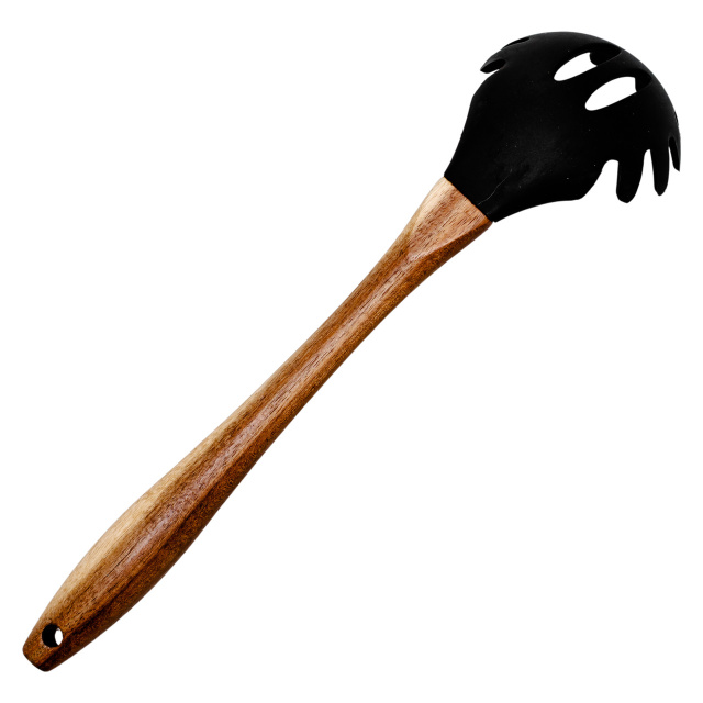 Силиконовая ложка для спагетти — незаменимый аксессуар для любителей пасты. Изготовлена из пищевого силикона, она бережно взаимодействует с антипригарной посудой, не оставляя царапин. Широкие зубцы аккуратно захватывают спагетти или лапшу, а продуманное отверстие в центре позволяет эффективно сливать воду. Ложка оснащена длинной деревянной ручкой, которая удобно лежит в руке и защищает от ожогов при работе с горячими продуктами. Такой аксессуар станет отличным помощником на кухне и подойдет как для домашнего, так и для профессионального использования. Основные характеристики силиконовой ложки для спагетти: Размер: 30×7.5см; Длина: 30 см; Материал рабочей части: силикон; Материал ручки: дерево. Силиконовая ложка для спагетти с деревянной ручкой — это удачное сочетание функциональности, безопасности и стильного дизайна. Она обеспечит комфорт в приготовлении пасты, прослужит долго и легко впишется в кухонный инвентарь любой хозяйки.