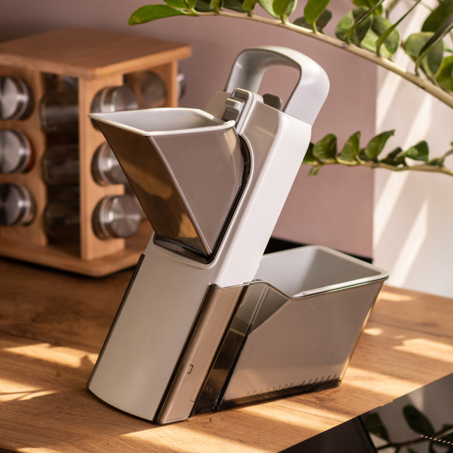 Овощерезка-слайсер с контейнером для нарезки — это удобный и многофункциональный кухонный помощник, который позволяет быстро и безопасно нарезать овощи и фрукты различными способами. Устройство оснащено широкой загрузочной горловиной и ручкой для удобного нажатия, что облегчает процесс шинковки. Главная особенность — регулируемый режущий механизм, не требующий замены лезвий. С помощью поворотного переключателя вы можете легко выбрать желаемую форму и толщину нарезки: тонкую или крупную соломку, ломтики, кубики. Все нарезанные продукты сразу попадают в вместительный контейнер, сохраняя порядок на рабочей поверхности. Основные характеристики ручной овощерезки: Размер: 19×12.5×34 см; Материал: пластик, нержавеющая сталь. Преимущества ручного слайсера для овощей: Простая настройка нарезки — без замены лезвий; Плавная регулировка толщины слайсов и соломки; Контейнер для сбора нарезанных продуктов; Удобная ручка для безопасного использования; Подходит для большинства овощей и фруктов. Овощерезка-слайсер — это отличный выбор для тех, кто ценит комфорт, скорость и порядок на кухне. Универсальность настроек и простота в использовании делают её незаменимой для ежедневного приготовления блюд как дома, так и на даче.