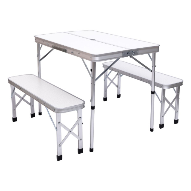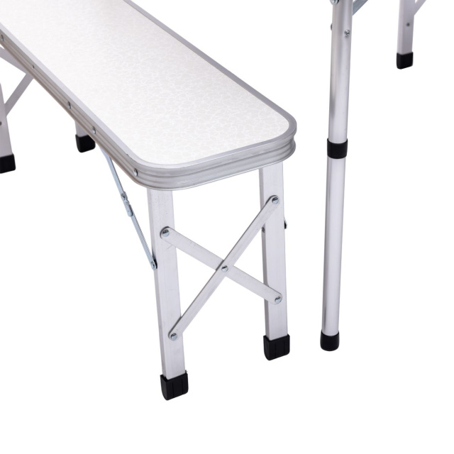 Туристический складной набор мебели (стол + 2 скамейки) — практичное и удобное решение для отдыха на природе, кемпинга, дачи, пикника или путешествий. Набор рассчитан на комфортное размещение 4–6 человек и легко складывается в компактный кейс с ручкой, что делает его идеальным для транспортировки и хранения. Надёжная конструкция и качественные материалы обеспечивают стабильность и долговечность в использовании. Основные характеристики набора складной мебели для кемпинга: Размер стола в разложенном виде: 90×60×39.5/70 см; Размер стола в сложенном виде: 90×10×30 см; Размер лавочек: 87×23×38 см; Материал каркаса (опор) стола: алюминиевая круглая труба; Материал столешницы стола: МДФ 4.5 мм; Материал каркаса лавочек: алюминиевая труба; Материал сиденья лавочек: МДФ 4.5 мм. Преимущества набора мебели для пикника: Быстрая сборка и разборка; Компактность при хранении и перевозке; Лёгкий вес благодаря алюминиевому каркасу; Отверстие для зонта — защита от солнца в жаркую погоду; Устойчивость и надёжность конструкции; Удобство и комфорт в любых условиях. Этот складной комплект станет незаменимым спутником для всей семьи во время отдыха на свежем воздухе. Он сочетает в себе удобство, надёжность и мобильность — всё, что нужно для комфортного выезда за город.